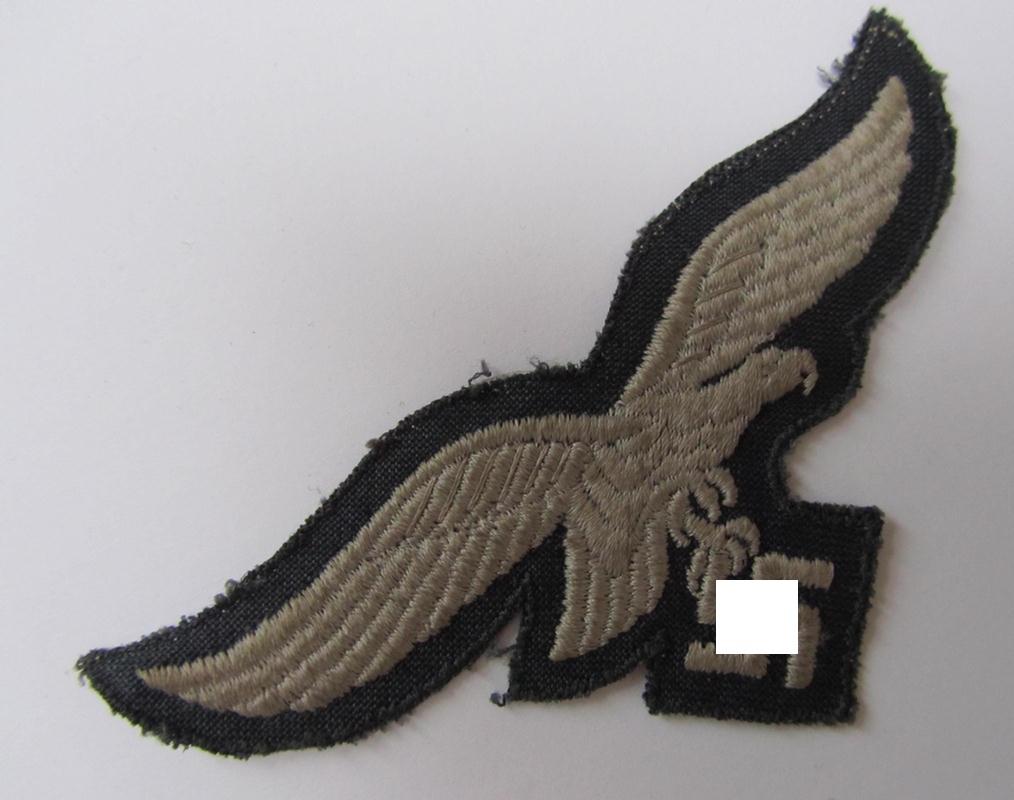 This is a very nice and IMO truly rare WH (Luftwaffe) breasteagle, executed on thin bluish-grey cotton, in unissued condition. These eagles are often encountered on the (mid/late war) 'Fallschirmjäger' jump-smocks ('Knochensäcke'). This example originates from a small collection of 'veteran' bring-back LW eagles that I was able to acquire. A nice and rare piece of LW cloth!