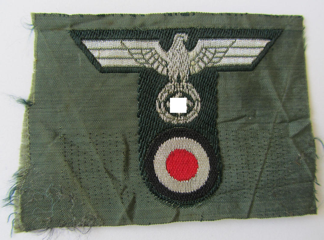 This is a nice and unsual item: a clearly used example of the rarely observed WH (Luftwaffe) shirt-eagle as worn on the greyish-blue summer-shirts, that is still attached on the shirts' pouch as worn. The eagle has faded a bit (and it is also a bit dirty) but is still in a gorgeous condition. The eagle has great detail and is executed on the same background as the am summer-shirts. Simply a nice LW item in wonderfull and truly worn condition!
