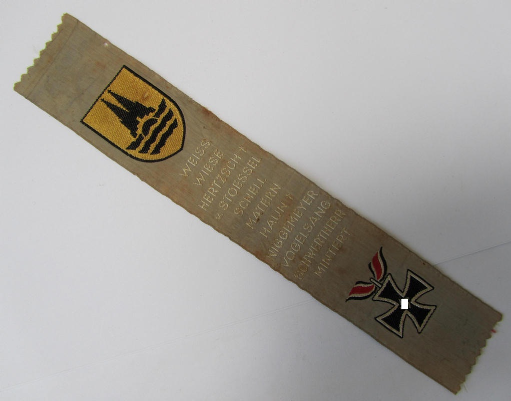 This is a nice and most certainly unusal item: a 25 x 4,5 cms. sized - neatly BeVo-like woven so-called: 'page-holder', handed-out in order to commemorate the various Knightscross holders ('RK-Träger') within the '26.Infanterie Division', in used condition. The piece depicts the 'traditional' badge of this division (a twin-towered church on a light-yellow back-ground) and a nice woven version of the 'Ritterkreuz': in between the names of 11 famous 'RK-Träger' (being: Weiss, Wiese, Hertzsch, v. Stoessel, Schell, Matern, Haun, Niggemeyer, Vogelsang, Schwertherr & Mintert) are to be found. The detail on this piece is truly very nice. The piece shows some slight staining but is in fine order overall. A nice 'Infanterie'-related commemorative piece!