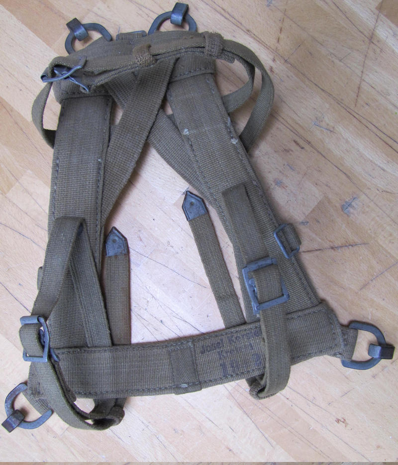 This is a very nice and only slightly used, WH 'A-Frame' ('Gefechtsgepäck') that comes complete with all its cloth lashes, metal-loops and tan-coloured cotton straps present. The frame is naturally fully functional and shows a clearly readable date and producers' stamp ('Josef Kersten - Krefeld - 1942') stamped in blue-ink. The 'pack' is only sligthly used and does not show any rust nor damage (both its metal rivets are original to the frame and were not re-mounted or alike). This one was surely issued and used and can be graded as a true DAK ('Afrikakorps') item. All metal parts still retain their greyish finish (and do not show rust or alike). The piece comes with its (rare!) specific, horizontal (all webbing) strap having two loops, intended to hold the mess-tin. A nice and scarce piece of equipment which is IMO almost impossible to upgrade!