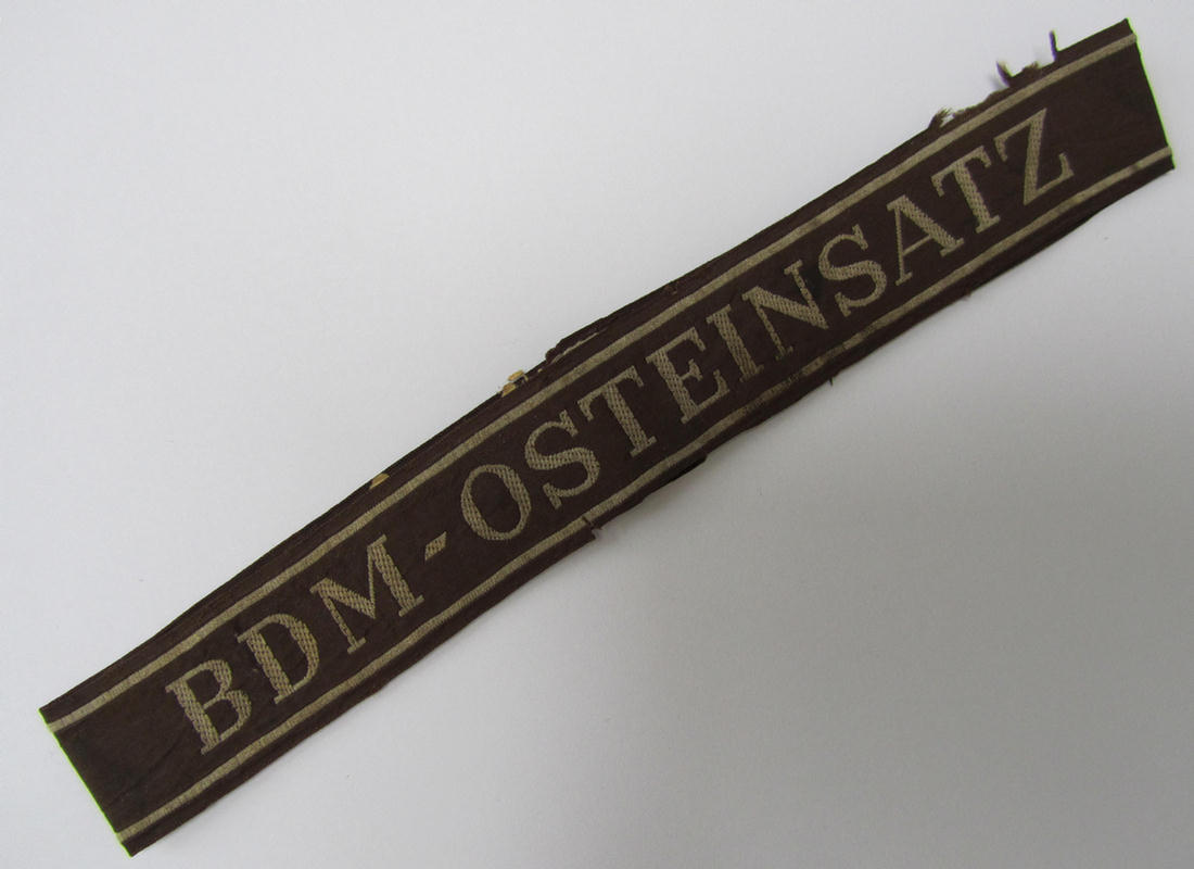 This is a nice example of the rare HJ/BDM ('Bund Deutscher Mädel') cuff-title: 'BDM-Osteinsatz' (BDM eastern action), executed in neat BeVo-weave, in cleary used & tunic-removed condition. The cuff-title - which is IMO slightly shortened and measures: 39 cms. - is woven in greyish-white on a brown coloured background. It was worn on the lower left sleeve and was awarded to BDM members who served as volunteers in the occupied eastern territories. The piece is clearly tunic-removed and shows some minor damage on the borders (caused by the removal) but this is IMO not that shocking. It also has been glued in an album once and shows some minor glue remains. It still shows the remains of its orginal 'RzM' etiket. Simply a very rare and desirable youth cuff-title which is not often offered for sale!