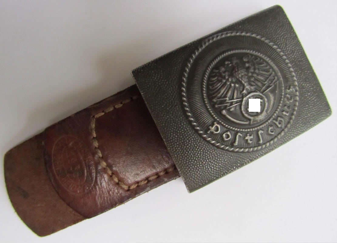 This is a nice example of the very rare green-coloured, 'pebbled' aluminium 'Postschütz' belt-buckle that comes on its maker-marked and dated leather tab ('Richard Sieper u. Söhne' - 1938), in nice, only slighty used condition. This piece - which still has a fair bit of its original green coloured finish remaining - has truly great detail and is nicely maker-marked: 'R.S. & S' on both tab and buckle (which signifies that it is produced by the: 'R. Sieper u. Söhne' company based in Lüdenscheid). The (natural) coloured tab is slightly used and shows some wear and age (it is however fully souple and functional). One of the most desirable and rare TR-era buckles in existance: something that justifies the high asking price!