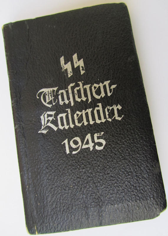 This is a neat little item that I have never seen before: a Waffen-SS so-called: 'Taschen- kalender' (pocket-diary) 'Der Soldatenfreund', 1945 issue. The diary - 12,5 x 8 cms. - is unissued and all pages are void of entries or notes. These small diaries were much welcomed due to their additional contents (articles, pictures, vocabulary and coloured maps of all possible German insignia, ranks flag etc.!. The diary is in very nice condition and just shows some minor areas of age & wear (something that is remarkable due to the very bad quality paper used). The fact that these small diaries were still issued in 1945 is truly remarkable: I have never heard of a '1945' edition and taken into account that the '1944' issues are already considered rare, I simply had to aqcuire this item (although its high asking price!) for the web-site. Of particular interest are the (coloured) pages 4 & 5: these show some never before seen collar-patches, such as the one pictured for Hungary (Ungarn). Simply a very nice and desirable item!