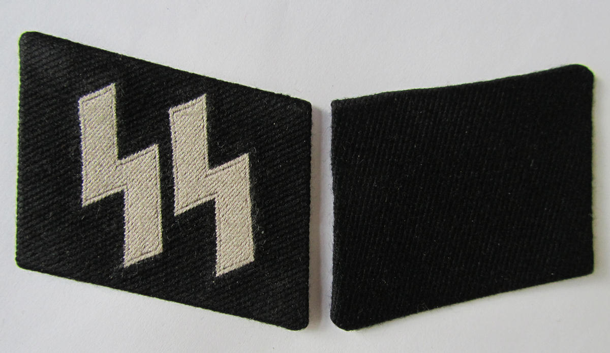 This is a truly rare Waffen-SS 'BeVo' style collar-tab set, comprising of a runic tab and rare rank-tab. It should be noted that he black rank tabs are 1000x more scarce than their runic counterparts and almost impossible to find. Both tabs have the 'white carton-like' backing as often observed. I know that this set is highly priced but it should be noted that in 30 years of collecting, I have only encountered a handfull of such sets. This set was found together and I will not separate them and only sell them as a set. A truly nice and rare Waffen-SS rank-tab set!