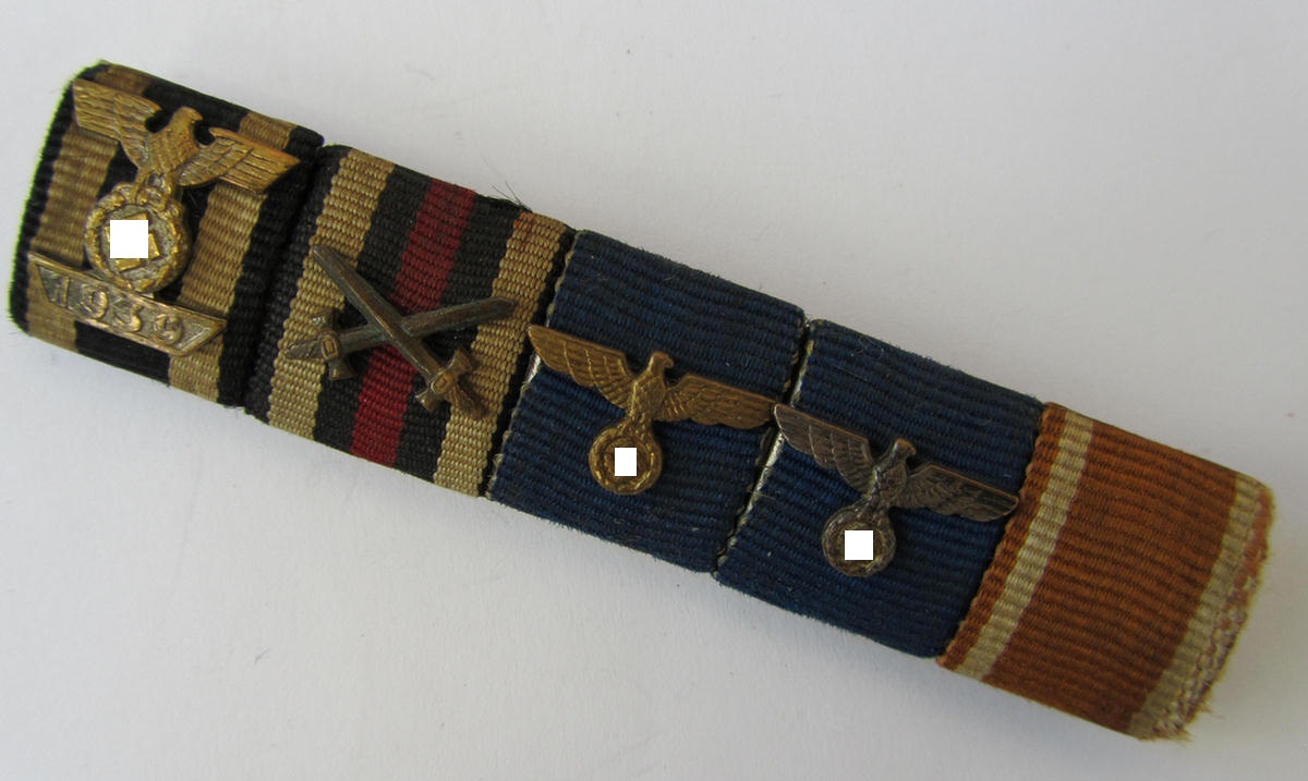 This is a very nice (and unusual!) 5-piece 'high-quality' medal bar / 'Bandspange', showing amongst others a WWI IC 2nd class with (very detailed and scarce!) 'Wiederhohlungsspange' miniature (actually a rare so-called: 'Halbminiatur') & two WH 'Dienstauszeichnungen', both with attached eagles, in nice, albeit clearly used, condition. The other medals are a WWI 'Kriegsteilnehmer' medal with attached swords and a 'Westwall' medal. All ribbons are of the smaller i.e. regular (1,5 cms. wide) version: all four attachments show tarnish and wear but are very detailed. The bar is in nice albeit slightly used condition (some stains visible) and has a functional pin & catch. I deem that the presence of the rare 'Halbminiature' merits the rather high asking-price: the price I got it for was also very high but I simply wanted this item for the site. A nice 'Bandspange' that belonged to a soldier that showed bravoury in both WW's: great to 'upgrade' any (officers') tunic!