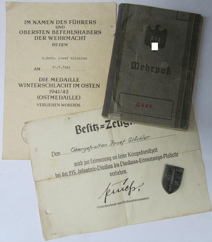 This is a very nice (and truly rare!) small (ie. 4-piece) award-document-/Truppentraditions- abzeichen-related group, comprising of a Truppentraditionsabzeichen des 215. Infanteriedivision plus rarely encountered Besitzzeugnis, a Wehrpass and Ostmedal award-document, all awarded to the Obergefreiten Josef Glöckler, who served in this division, all in nice, albeit clearly used, condition. This rare Traditionsabzeichen (or 'Plakette' as officially known) is executed in zinc and comes complete with its original pin-attachement: it has IMO never been cleaned nor polished. (The badge is also pictured in the Heering-Hüsken Abzeichenkatalog, wherin it is given the number 9817a and an estimated price of 225 Eu!). It comes with its - never before encountered - accompanying: Besitzzeugnis (which is signed by Generalleutnant und Divisionskommandeur, General der Infanterie Baptist Kniess). Of additional interest is the fact that this (semi-official!) badge was also properly entered in Glöcklers Wehrpass: on page 38 it is entered (and given a - very late! - date of June 1942!!). As stated comes this group also with Glöcklers Wehrpass, which is in an overall nice (albeit clearly used) condition. The WP comes somewhat loose from its cover but it retains all pages and is not denazified nor damaged whatsoever: it bears a uniform-picture of Glöckler and is really full of entries and notes. It also shows that Glöckler participated in various battles. Glöckler was also awarded the Winterschlacht im Osten medal on 31 July 1942: his A-5 sized award-document is also still present with the group. Simply a nice and very complete Truppentraditionsabzeichen-related group: maybe a one-off opportunity to acquire it in this complete condition!