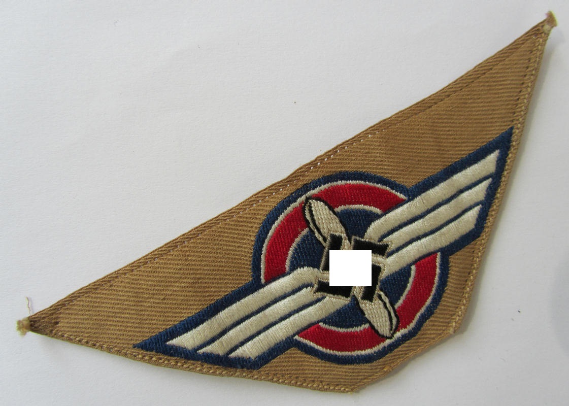 This is a very nice & clean example of the rare HJ (Hitlerjugend) pre-war - ie. after 1938 worn - arm-badge, belonging to a member of the 'Luftsportscharen', in nice, slightly used and clearly shirt-removed condition. The badge - which is nicely woven in BeVo like weave - depicts white stylised wings and propellor overlaid with a white-edged, black swastika set on a red circle, all on a tan background. Although the 'Luftsport- scharen' (air sports squad) was set-up under the auspices of the DLV ('Deutches Luftsport Verband') it became generally known as: 'Flieger HJ'. This example still shows the stitching holes and shows almost no usage nor wear (some small staining is visible). A truly rare badge that does not appear often for sale: impossible to upgrade this example!