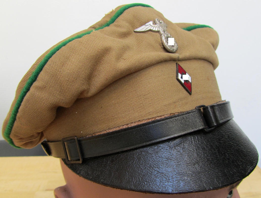 This is a rare and unusual item: a nice - and actually early - tan-coloured 'HJ' visor-cap (or 'Mütze für HJ/DJ') which is named to a certain: 'Egon Nagler', having the neat 'grass-green' piping (='Landjahr'), that comes with its originally attached 'RzM' etiket as per regulation, in an overall very nice, albeit clearly worn condition. The cap - which is of a nice so-called: 'Sattelform' - has all the looks as to be expected from an original piece: the fairly thick leather visor, the typical chin-strap and both insignia are present and (IMO) original to the cap. The piece originates from a private household and was never before in a collection. The cap is piped with the (woolen-type), grass- ie. bright green branch-colour, signifying that it was a cap that belonged to a participant in the HJ 'Landjahr' movement. The leather sweat-band is in overall fine condition but shows one tear (nothing shocking though): it shows the normal marks of having been regularly worn. The cap is in a very nice condition and only shows one minor flaw ie. damaged area on the top (visible on the photos): also this I deem not disturbing. The piece shows the (linnen) etiket on the inside (as per regulation) identifying this piece as a 'Mütze für HJ/DJ' of the model as authorised by the 'Reichs-Jugend-Führung' in December 1934. The cap shows three times the name of the bearer (a certain: 'Egon Nagler'): twice this is written on the inside of the sweat-band and the third time it can be read from the small paper that is stored under the 'Mica' triangle. The pictures do actually no real justice to this nice and rare piece: in hands it is much nicer! A stunning piece of HJ/DJ headgear!