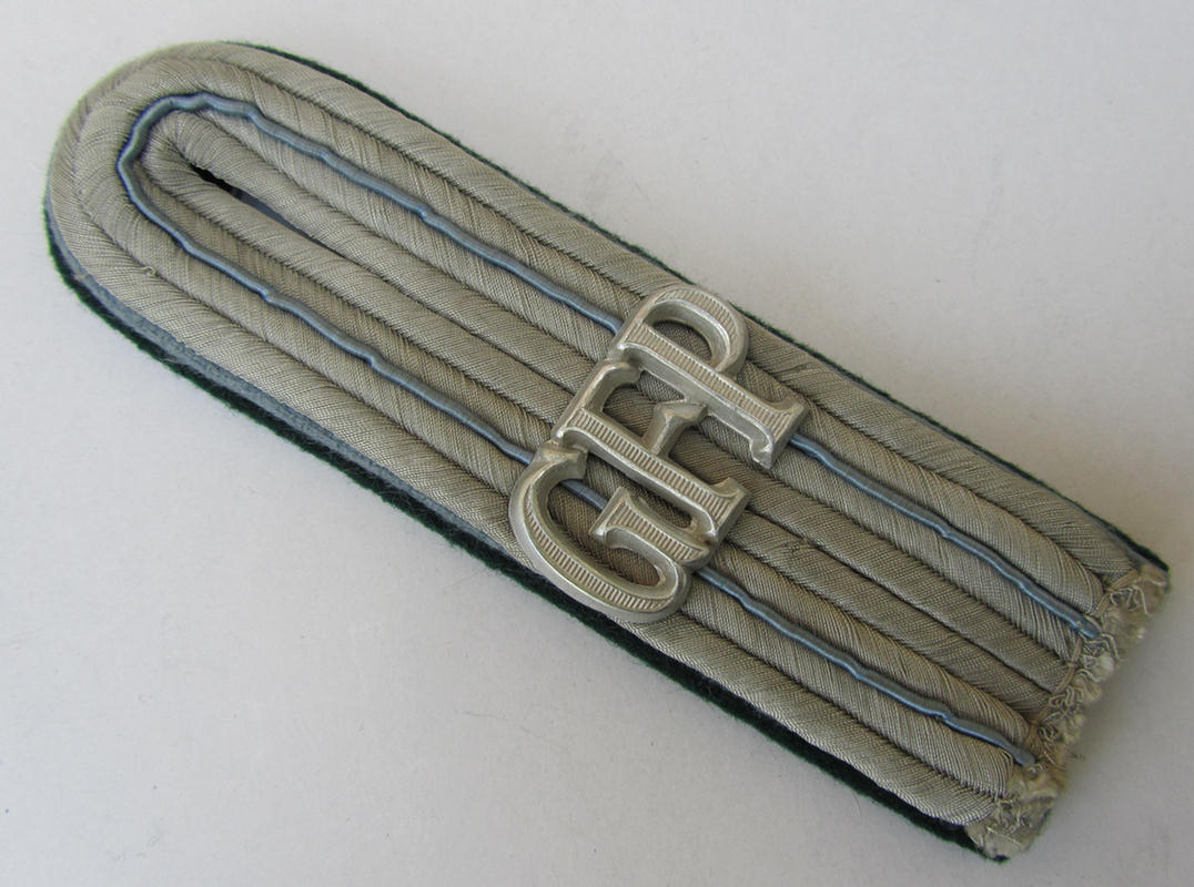This is a truly very rare - albeit regrettably single - 'cyphered' WH (Heer) shoulderboard, as intended for a 'Feldpolizeisekretär der Geheime Feldpolizei', in nice, only slightly worn condition. The board - which is of the 'sew-in'-type and never had a tongue has the typical green woolen (moleskin) underlay and light-blue secondary branch-colour. Moreover, does the boards' deck show a light-blue 'inner-strip', as was prescribed per regulation. The board has the white-metal (aluminium) 'GFP' cypher originally attached. The exact tasking of this very obscure - and most certainly very small - units is not exactly known but had to do with espionage within the army (Heer), similar as employed with the German 'Abwehr'. A really 'one of a kind' shoulderboard!