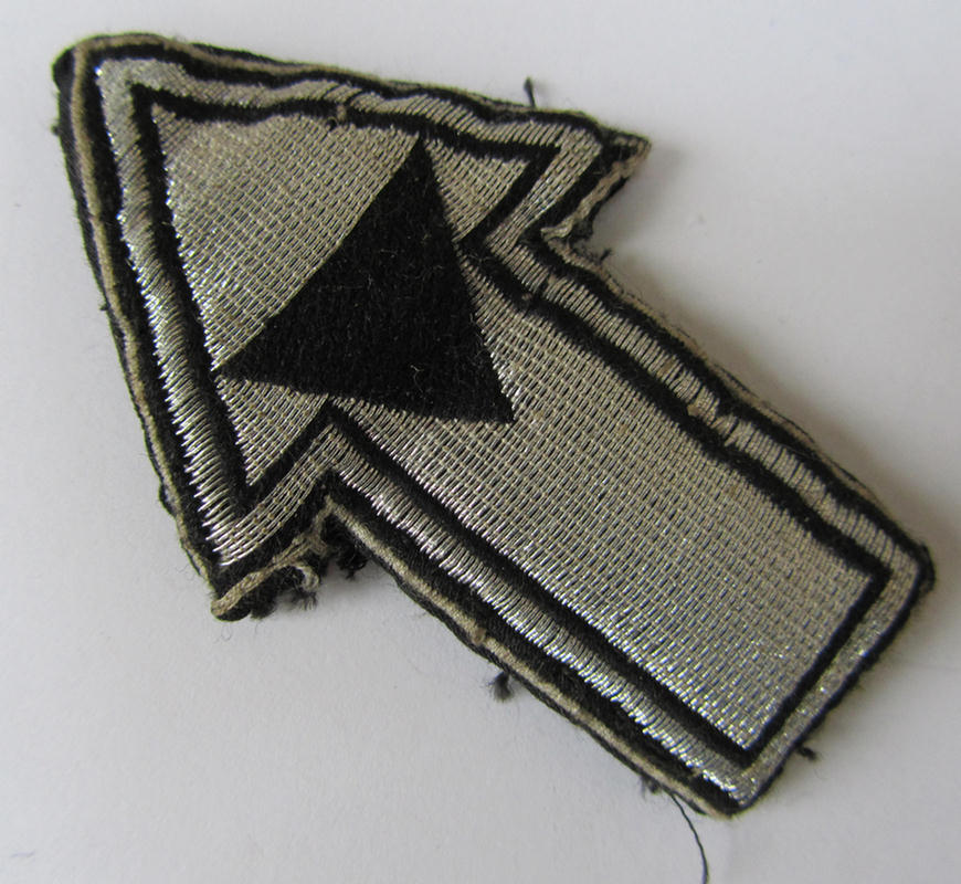 This is a truly very rare TeNo ('Technische Nothilfe') arm-badge intended for a 'Lehrgangsteilnehmer an den Reichsführerschulen der TeNo' (=student at one of the TeNo elite training-schools), having attached maker-etiket, in very nice and clearly tunic removed condition. The badge - which is woven in so-called: 'flat-wire' weave technique - shows extraordinary detail and also bears a (linnen) etiket bearing the makers' name and patent-pending (being: 'G & W'). These insignia were worn on the lower left arm of the dark-blue (officers') type 'TeNo' uniforms. The badge orginates from the same officer as the 'hand-embroidered' TeNo arm-eagle, which I offer under number: 20137. Both pieces originate from a private house-hold and were never before in a collection. A very nice and desirable piece of insignia!