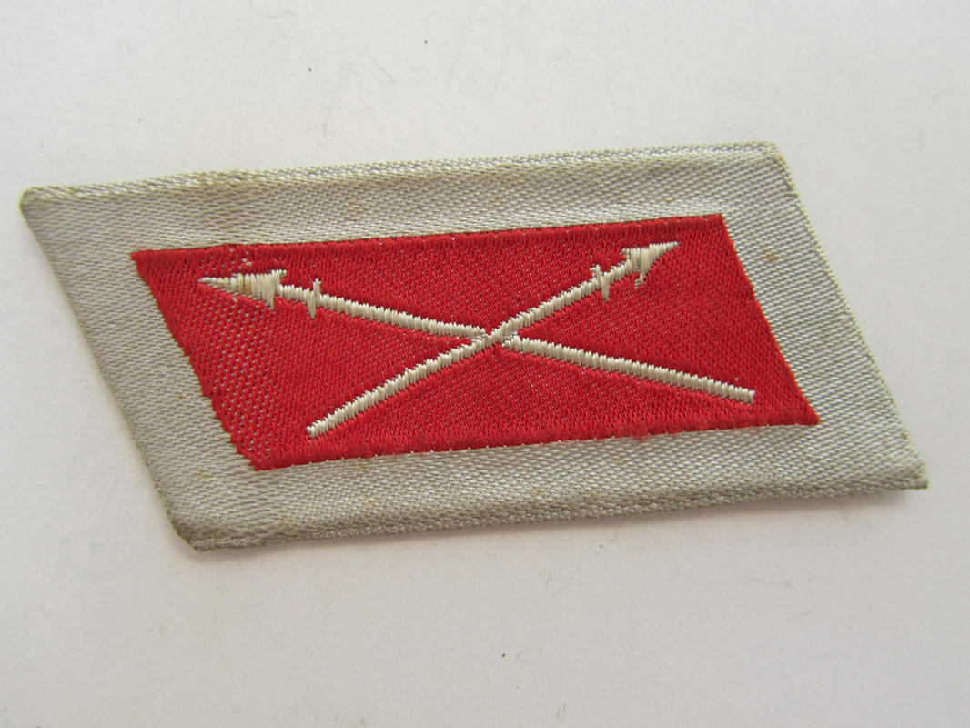 This is an extremely rare - albeit regrettably single - 'BeVo'- woven, officers'-type: 'Cossack' collar-tab, depicting two crossed arrows on a bright-red background surrounded by a silver cadre, in nice, only sligthly used (or unissued?) condition. The tab is beautifully woven in so-called: 'BeVo' style: the piece is 'pre-folded' and backed with a piece of carton. This is only the second such tab I have ever encountered in my collectors' life and is surely a piece of great rarity. Simply a fantastic piece of Eastern volunteer related insignia!