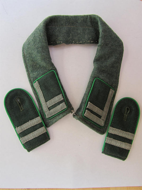 This is a very nice - and truly unsual and most certainly very rare! - set of fully matching 'Ostvölker' collar tabs (woolen version) & matching shoulderboards, as worn by a 'Unteroffizier' in the 'Aserbaidschan' Legion, still originally mounted on its original field-grey collar, in very nice & only slightly used condition. The collar is fabricated in standard field-grey wool and is backed with dark-green herringbone twill: it is very carefully removed from a tunic: it still has the originally attached, dark-green coloured, woolen (moleskin) collar-tabs as intended for an 'Unteroffizier' in the 'Aserbaidschan' Legion. The tabs have the neat grass-green silk-like type piping and have the rank-signification executed in the bluish-grey and sub-dued NCO-braid. The - fully matching! - set of shoulderboards are equally nice and measure 10,5 cms. in length. Also this pair has the neat grass-green silk-like type piping as well as the rank-signification of Uffz. executed in the bluish-grey and sub-dued NCO-braid. The boards come naturally on their original tongues. These insignia were - as possibly known - often mounted on old stocks of (foreign) uniforms that were captured during the beginning of WWII. These for example Czech- or Dutch uniforms were regarded as Kriegsbeute and often re-distributed to the troops of the Ost-Legionen. This set originates from such a tunic: it was years ago removed from a captured Dutch tunic and was stored for years as such. I had several times a loose tab or board, but never before a matching 'Aserbaidschan' Legion set for sale. Simply a very rare foreign-volunteer related set for which I deem the - rather high - asking price appropiate. Maybe a one-of opportunity to acquire such a complete, matching Ost-Legionen set!