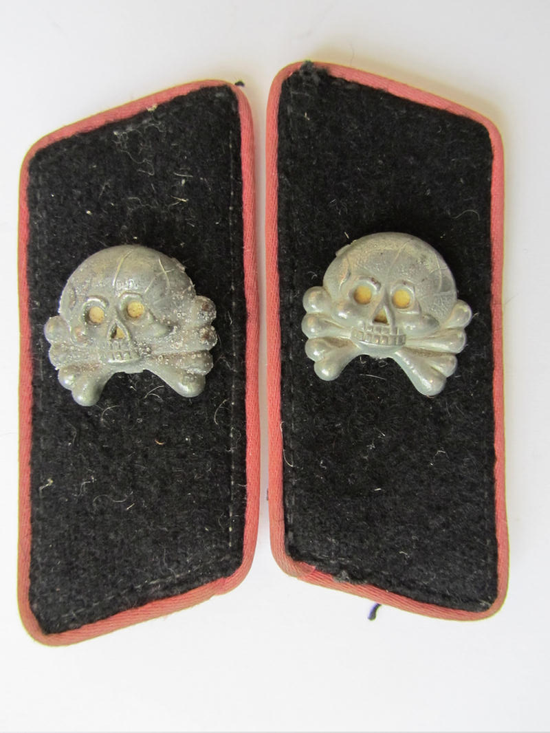 This is a rare and surely unusual pair of WH (Heer) pink-piped 'Panzer' collar-tabs having attached matching metal skulls as used on the black-coloured 'wrap-around' Panzer tunics, in clearly used and uniform-removed condition. The set has the dark-yellow 'buckram' backing and both skulls (retaining their original pins) are IMO originally attached: one of the skulls shows some minor zinc-corrosion. Of additional interest is the fact that the PZ soldier who wore this pair, added pieces of white felt (ie. wool) behind the skulls, giving the set a more 'lively' appearance. The set - which has the neat 'silk-like' type pink-coloured piping - is in clearly used and uniform-removed condition (stitching-holes are still visible) and would be excellent to restore a black Panzer tunic! A nice and desirable set that originates from my own collection: I bought this set years ago from a private house-hold. I know that the asking-price is rather high for this set but an original and matching set is nowadays almost impossible to encounter!