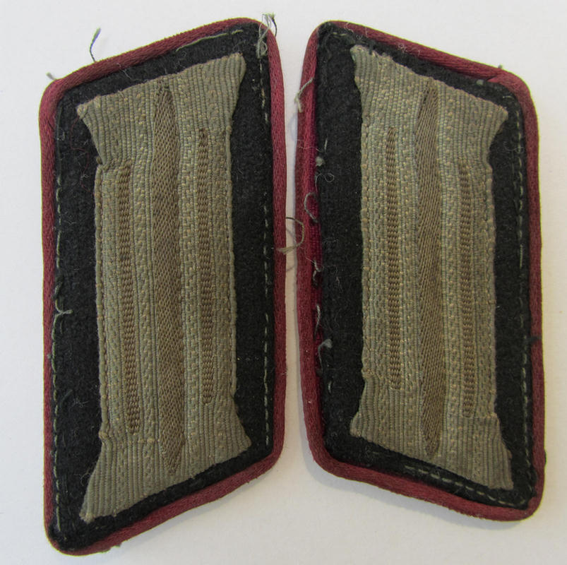 This is a very nice (and most certainly very rare!), fully matching pair of collar-patches, having the neat 'Karmesin'-red (ie. purple-like) piping (= 'Nebelwerfer' or smoke-troops) and greyish 'Einheitskragenspiegel' mounted on a dark-green woolen background, as used on the field-grey 'Sturmgeschütz' wrap-around tunics, in clearly used and uniform-removed condition. The set was found at a local German flea-market and was never before in a collection. The set - which shows some clear usage and wear - was absolutely once mounted on a tunic (stitching remains are present) and was carefully removed (the piping on one of the tabs comes somewhat loose but nothing shocking though). The tabs are 'backed' with the typical, brownish 'Buckram'-like material and are somewhat dirty (caused by wear). I have personally NEVER before encountered such a set and I deem it a beautiful pair of unquestionable rarity: something that merits its high asking price!