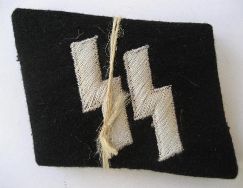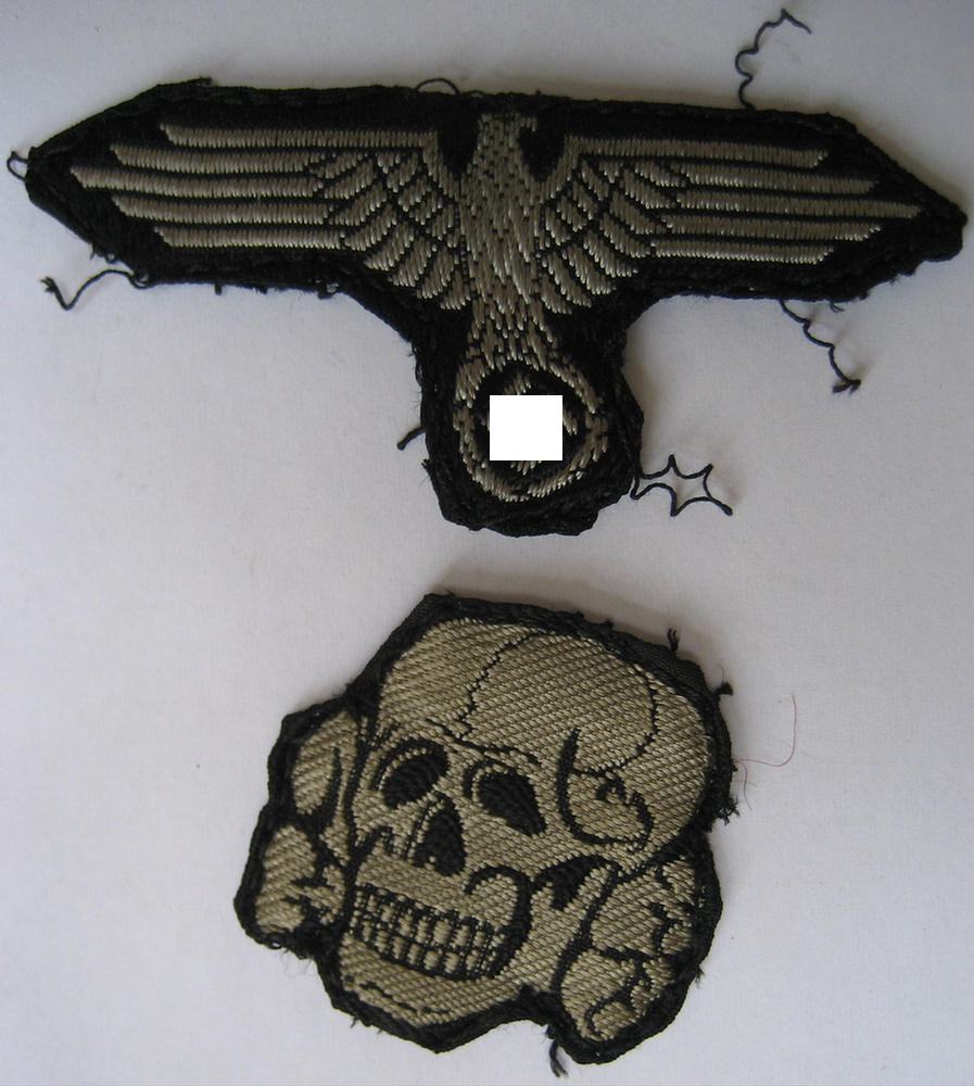 This is a nice and nowadays rarely encountered set comprising of a Waffen-SS BeVo style cap eagle and accompanying - small sized - skull, both in confectioned and clearly cap removed condition. Both are neatly executed in so-called 'BeVo' weave style and can easily be mounted on a Waffen-SS side-cap or even M43 cap. The skull - which is of the smaller sized type - as well as the eagle show some normal age and staining. A very nice set that is not cheap but nowadays fully worth its money! These original sets are almost impossible to find!