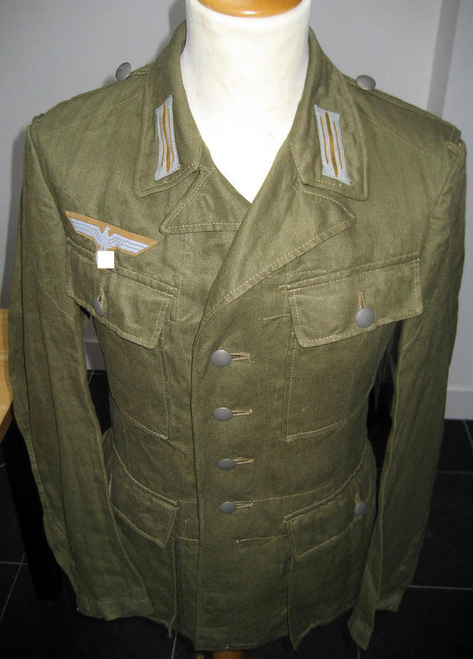 This is a beautiful WH (Heer) tropical jacket - 2nd model - with both tropical BeVo breast-eagle and tropical collar patches originally attached. The jacket - which is a fair size and would easily fit a mannequin - is in mint, unissued condtion. Naturally are all buttons originally attached to the jacket (the front buttons are removable which is standard). The jacket is nicely dated (1943) and RbN.-numbered. Both eagle and tabs are factory attached by using the same thread as used to construct the entire jacket. Both shoulderboard loops are also present. To nowadays find such a jacket in this pristine condition is considered rare! Please let me know if you need additional pictures: with pleasure I can provide these!