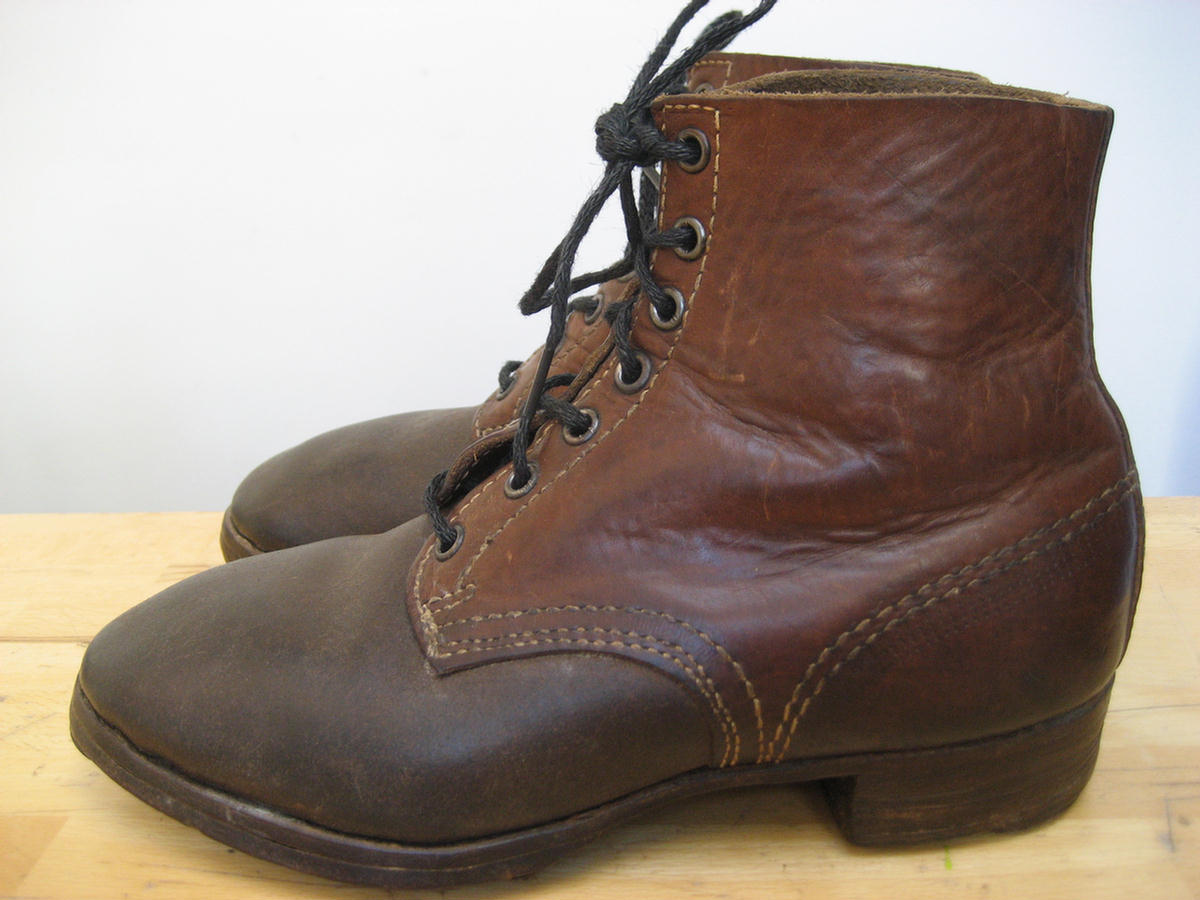 This is a beautiful and rare brown-leather pair of matching WWII German low-boots in wonderfull condition. The pair is surely used and shows some normal wear and aging: the leather, however, is very souple and fully functional. All iron parts (like the hub-nails) are a tiny bit rusty but present: so are the (original) black cotton laces. The boots are neatly marked: '25 5 45 3727 4' on the sides (as it should be). Also the soles and inside show a size marking. These are the 'real thing' and NO Czech or post-war copies and I back this up with a life-time garuantee on the originality. Needless to mention how rare period German foot-wear actually is: mainly because these where also used after the war as 'regular' shoes. A very nice and text-book pair that would look super on a mannequin!