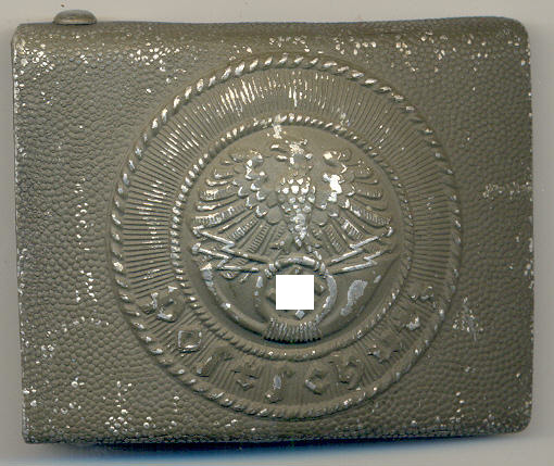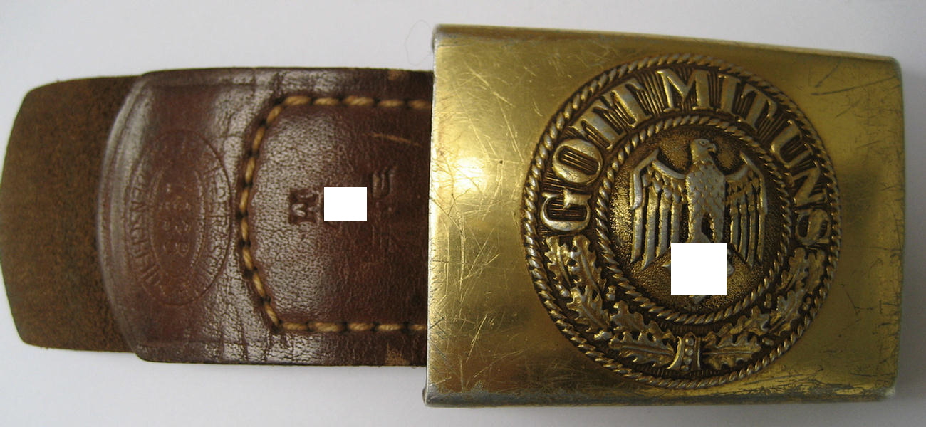 This is a very difficult and scarce buckle to find: a WH ('Kriegsmarine') golden aluminium buckle with leather tab by the company of 'R.Sieper und Söhne' (= 'R.S.S.') IMO the only producer of this type of buckle. The buckle is clearly used but still has a fair bit of its golden finish remaining and is in great shape. The buckle bears the company logo 'R.S. & S. as is the leather tab. The tab is dated: '1938' and also bears a KM 'Abnahme' stamp (M over the eagle), something that is not often encountered! The buckle is expensive but worth its money: it will be hard to find a better example for a better price!
