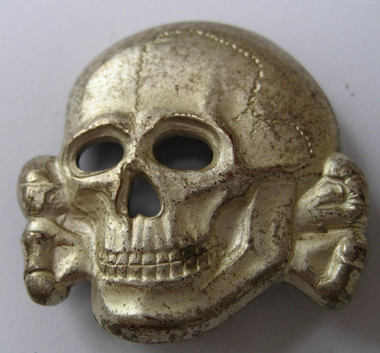 This is a very nice Waffen-SS visor-cap skull, which is executed in silver-finished copper-toned metal (so-called: 'Cupal'). The skull is nicely 'RzM 499/41' marked and could be refferred to the as a text-book 'Zimmermann' piece. The skull retains almost all its silver finish and shows normal wear but regrettably misses one of its prongs. Still a nice and desirable piece!