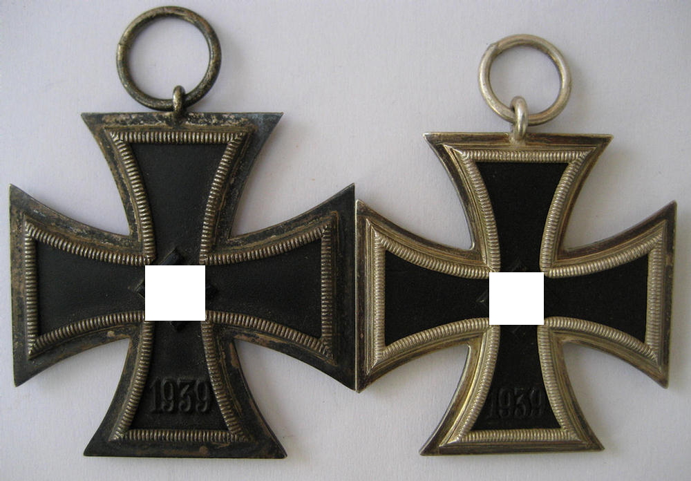 This is a truly rare item: a very nice 'EK2. Klasse' executed in so-called: 'Übergrosse'-size. These over-sized examples are approximately the same size as a 'Ritterkreuz', measuring 47 mm. instead of the regular 42/43 mm. The difference in sizes is obvious and even more so if compared with a standard size EK/IC (see pictures). This piece has never been cleaned and shows a nice (blackened) patina. It comes with a full-length, unconfectioned ribbon. The piece is unmarked and has a nice (and undamaged) black core. A very nice and truly rare item!