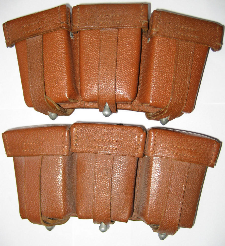 This is a beautiful set comprising of two, tropical WH (Heer) orange-brown pebbled leather, 'K98' ammunition pouches. The pouches are nicely maker-marked and '1941' dated (the tiny oval stamps are hard to read though). The pouches are IMO only slightly used and show only little to none wear or aging. The inner dividers are present. These pouches which were standard for tropical use (DAK) - and which colour is almost orange! - are very scarce to find. A nice matching set in a wonderful condition!