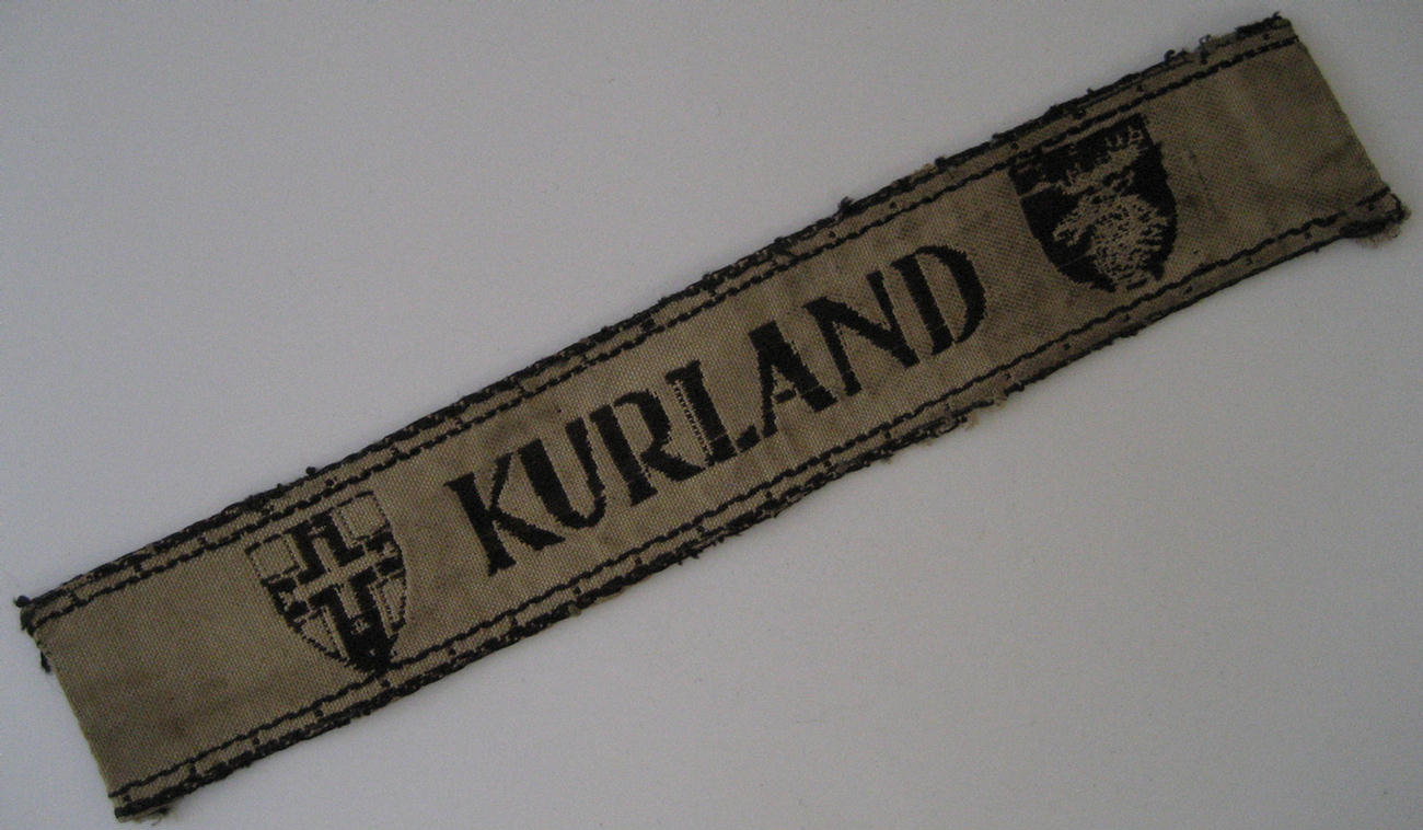 This is a text-book example of the 'Kurland' cuff-title. The armband is full-length (approx 24 cms.) and both ends show some normal fraying as is often the case with these bands). The band is in very nice, slightly used condition and has no flaws whatsoever (it shows some normal staining of having been worn on a tunic once. The cuff-title is executed in black cotton on a white (cotton) background. It should be stated that this is not a commemorative cuff-title (such as the 'Afrikakorps' cuff-title) but an official award that needed official recognition. A very nice and original example!