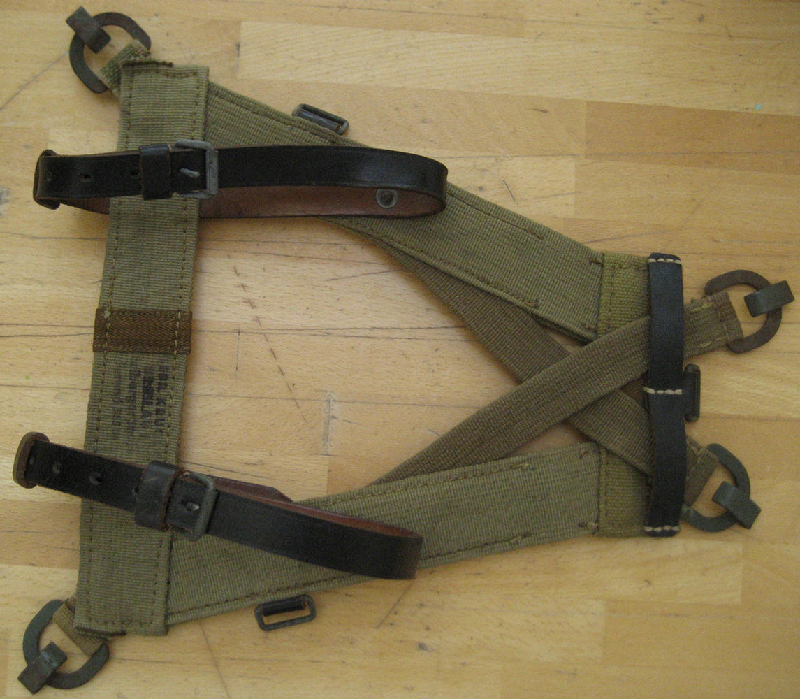 This is a very nice, only slightly used (IMO mint) WH 'A-Frame' ('Gefechtsgepäck') with all its leather lashes, buttons and black leather straps present. The frame is naturally fully functional and shows a clearly readable stamp ('Gebr. Krüger - Breslau'). It should be mentioned that this piece is in full original condition: no re-riveted leather straps etc. and has never been cleaned or oiled (the green coloured attachment hooks show some minor rust from years of storage). The leather straps are not 'cracked' or damaged. This is of course the 'real thing' and not a modern copy: I naturally give a life-time garuntee on its originality. A nice and scarce piece of equipment which is IMO impossible to upgrade!