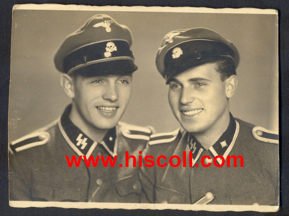 This is a very nice, post-card sized picture depicting two young Waffen-SS NCO's ('Oberscharführer') both wearing a standard visor-cap. The postcard (sized (11,5 x 9 cms.) shows two young men in uniform. The photo shows nice details (standard NCO visor-caps, RzM type collar patches, Ost-medal/IC2nd class ribbons and standard SS (dark-colour) piped boards). The photo is void of any writing. The picture originates from the same series as the previous number (12419). A very nice and original period photo!