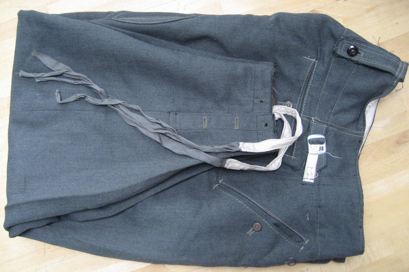 This is a truly nice and desirable example of the scarce WH (Waffen-SS or Heer) M43 model (1944 dated) soldiers' type trousers (or 'Keilhose') executed in smooth 'garbadine' (aka Italian) cloth. The pair has all original (glass!!) buttons originally attached and is very nicely 'RbN.' numbered and dated (1944). It is the '1943' pattern, having the reinforced bottom-piece and 'standard' white cotton lining. Both cotton tie-rips (intended to fix the pants when worn) are also present. The pair shows truly minimal wear and has no damage nor holes whatsoever. Naturally I provide a life-time garuantee on its originality. Simply a 'text-book' example that would look wonderfull when mounted on a mannequin!