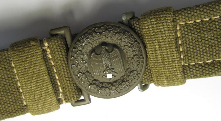 This is a truly stunning, WH (Heeres) 'tropical' (ie. DAK- or 'Deutsches Afrika Korps'-) related- officers'-type belt- and buckle set (aka: 'Tropenfeldbinde für Offiziere'), comprising of neat (alumium-based and/or field-grey-/greenish- coloured) buckle which comes mounted on a - approximately 99 cms.-long sized - belt that is maker-marked (hard to read) and that comes in an overall very nice- (ie. virtually mint- and/or unissued-), condition. The neat - and very detailed! - buckle, which is as stated an unmarked specimen (as always) retains almost all of its original (fairly 'matted') greenish- ie. field-grey finish and still has superb detail (there is no real damage nor wear visible: just some mininal traces of having been minimal handled ie. moderately used over the years). The buckle was IMO never cleaned and shows some minimal dirt and aging: it has as stated lost some of its green-painted finish over the years (IMO simply caused by handling as stated above). These belt-buckles saw only limited usage within the DAK (or: 'Deutsches Afrika Korps') but saw also usage in the later-war years (Balkan- and/or Mediterranean) combat-areas. The - truly mustard-green-coloured - belt - which is maker-marked and/or presumably dated as can be seen on the photo's measures approximately 99 cms. in length (something that is also reflected in the ink-stamp '100' on the back of the leather-based tongue). Moreover, are both webbing-based 'lashes' also present and in place (something that is most certainly not always the case!). The belt itself is as mentioned in an equally very nice condition: it only shows some minimal staining. The metal catch is also equally green-/ie. field-grey coloured (and totally matches as such the buckle). The set was most certainly worn as such and came as such from a private household in the USA: it was never before part of a collection. Simply a very nice (and fully matching!) tropical officers'-type belt-/buckle set that is IMO priced according to its superb condition: hard to find a better and matching set for a better price!