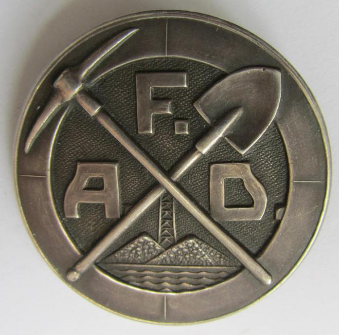 This is a truly attractive - and actually never before seen! - example of a pre-war-period- and/or genuine silver-based (ie. '900'-stamped), so-called: Austrian FAD (ie. 'Östereichischen Freiwilligen Arbeitsdienst') service-brooch (ie.: 'Ehrenzeichen des Östereichischen Freiwilligen Arbeitsdienstes') being a very detailed- and maker- (ie. 'A. Laredas' Nachf.'-) marked example and that comes in a wonderful- ie. very nicely preserved condition. The piece - which is quite large-sized and having an approximate diameter of 5,2 cms. - comes mounted on its (functional) pin-/catch-set-up (as can be seen on the pictures). It has a very nice (ie. somewhat darkened) age-patina and has with certainty never been cleaned nor polished: it comes as recently found at a private household. The piece - which shows a clearly present makers'-mark ie. logo (as mentioned above) - shows nice and/or pronounced detail but also shows the obvious signs of having been moderately worn (it is still a bit dusty as found and comes as stored for decades). The piece also shows some (undecypherable) inked text and shows an engraved number (presuambly an award- or serial-number!) that reads: '27'. I could not find any reference regarding this interesting piece and am quite convinced that it is a pretty unique and early FAD-related piece. As most likely known was the FAD (or: 'Freiwilligen Arbeitsdienst') the predecessor of the later founded RAD (or: 'Reichsarbeitsdienst'). Simply an attractive example of a (very early-pattern and with certainty rarely seen ie. possibly unique!) so-called: Austrian FAD (ie. 'Freiwilligen Arbeitsdienst') service-brooch that is IMO priced according to its rarity and desirability!