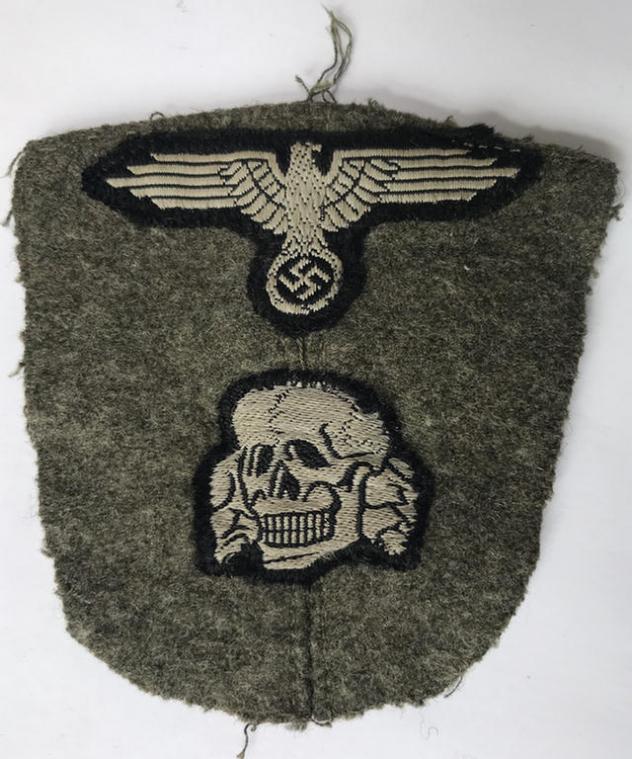 The attractive - with certainty very unusually- ie. rarely seen! - piece of a so-called: 'M43-pattern' (Waffen-SS-type) cap comes in a very nice (ie. clearly used- and/or nicely confectioned-), condition: both insignia-pieces are still (period-)mounted on a piece of field-grey-coloured wool that was carefully 'cut-out' of an M43-pattern field-cap (ie. 'Einheitsfeldmütze'). Both insignia-pieces are executed on silverish-grey-coloured linnen as to be expected - are nicely period-folded and still show the (machine-embroidered- ie. 'zig-zag'-type!) stitching with which they were period cap-attached (as can be seen on the pictures). The attractive piece - which was part of my personal collection for years - originates from the USA where it was without doubt brought as a so-called souvenir- ie.: 'veteran-bring-back'-piece after the war. Simply a very attractive Waffen-SS-related, 'BeVo'-style insignia-set that comes still period-mounted on its piece of M43-pattern cap and that can ideally be stored in any Waffen-SS cloth-insignia collection: I deem that I have priced this truly attractive specimen accordingly!