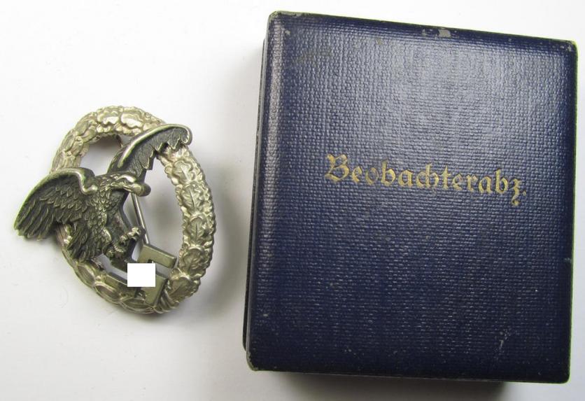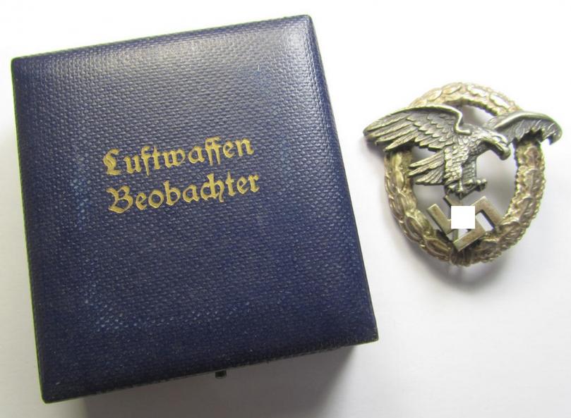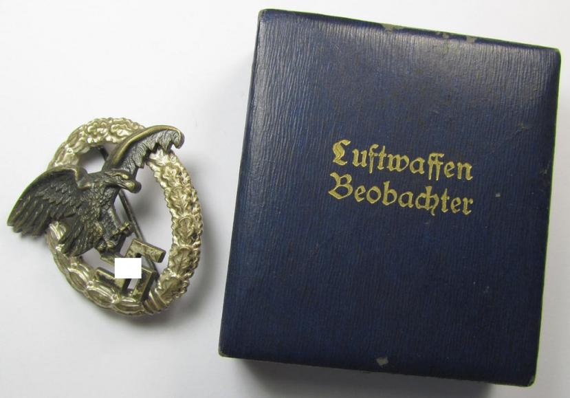 The IMO fairly early- (ie. pre-) war-period- and/or very detailed war-badge (ie. 'LW-Flugzeug-Beobachter-Abzeichen' or: observers-war-badge) has IMO only moderately been worn and comes naturally mounted on its fully functional (and fully unaltered) pin- and/or functional catch (ie. catch set-up). The award shows a 'separately'- (and/or very detailed!) bluish-black-coloured eagle-device attached (by means of two firmly attached copper-based rivets as is visible on the back). The badge truly retains most of its period finish but does show a minimally tarnished- (ie. typical 'Buntmetall'- ie. 'Tombak'-like-) age-patina as is more often encountered on these high-quality produced war-badges. The badge shows a clear makers-mark-signification (ie. 'A'-logo) and is in all respects thus an example that can be attributed to the desirable maker: 'Assmann u. Söhne': the award shows naturally all the specific details as known for a badge by this particular maker. The piece - which is IMO of the second pattern - is still somewhat stained ie. dirty but has IMO never been cleaned: the bright silver-coloured wreath and/or somewhat bluish-coloured eagle-device both retain a very nice albeit minimally tarnished appearance. The award came stored in its (scarcely seen!) blue-coloured etui that shows the (early-pattern-, fully preserved and/or golden-toned) text: 'Luftwaffen Beobachter' on its top (as can be seen on the pictures). This etui is equally nicely preserved and comes in a complete and/or fully functional condition. The set originates from a private household in Germany and was never before in collectors'-hands. These attractive and early-period: 'Flugzeug-Beobachter-Abzeichen'-sets can easily be graded: 'scarce'!