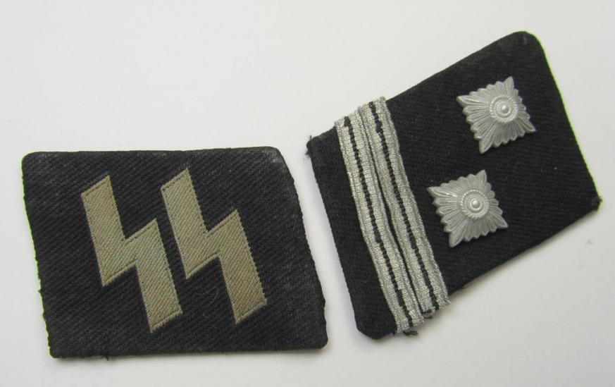 This is a truly very attractive - and with certainty rarely encountered! - Waffen-SS, NCO- pattern collar-tab-set (ie. 'Kragenspiegelsatz') comprising of a runic tab and rarely seen rank-tab both examples as executed in (identically styled!) so-called: 'BeVo'-weave pattern, that both come in an overall very nice- (ie. IMO issued-, worn- and/or carefully tunic-removed-), condition. It should be noted that the ('BeVo'-woven) black-coloured- and/or linnen-based rank-tabs are x-times more rarely encountered than their runic counterparts and are nowadays almost impossible to encounter. Both tabs have the white-coloured- and/or: 'Buckram'-based 'backing' (as can be seen on the pictures). I know that this set is highly priced, but it should be noted that in 40 years of collecting, I have only encountered a handfull such (matching) sets. This set was found together as such and I will not separate them and therefore only sell them as a pair. The runic-tab shows two (IMO aluminium- based-) pips and two pieces of (specific!) NCO-braid period-attached, denoting that this set was intended to be used by a (high-ranked!) Waffen-SS-NCO ie. 'SS-Sturmscharführer'. Without doubt a very desirable and rarely seen Waffen-SS NCO-collar-tab set!