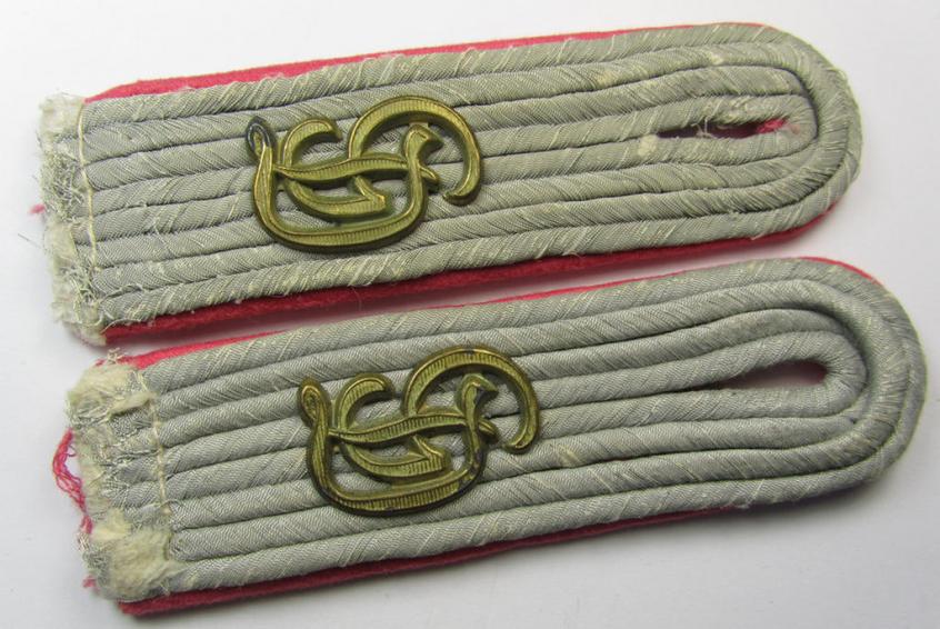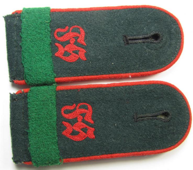 This is a very attractive - and/or fully matching! - pair of WH (Heeres), (IMO) early-war period, 'M40'-pattern (rounded-styled-) enlisted-mens'-type shoulderstraps as was piped in the bright-red- (ie. 'hochroter'-) coloured branchcolour as was intended for - and/or clearly worn by! - a: 'Soldat einerFeuerwerker-Schule' (or simple soldier ie. student who served within an army-artillery related ammunition-schooling institute) and that is (unusually!) showing a pair of green-coloured 'Laschen' period-attached and that comes in an overall nice- (albeit moderately used- ie. worn- and/or tunic-removed-), condition. The straps - which are both approximately 11,2 cms. sized in length - have the 'standard-pattern' and/or: darker-green-coloured-, woolen-based 'upperdecks' and have the bright-red- (ie. 'hochroter'-) coloured- and/or woolen-type piping ie. branchcolour attached (see pictures). The shoulderstraps show the neat, Gothic-styled- (and/or bright-red-coloured-) so-called: 'FS'-cyphers (which are executed in so-called: 'Kurbelstickerei' as to be expected) denoting that the soldier who wore these straps held the rank-ie. function of: 'Soldat einer Feuerwerker-Schule'. The pair comes mounted on its original tongues and does show some minimal age-, wear and/or staining (as can be seen on the pictures). Of additional interest is, moreover, the fact that this pair shows a (firmly- and period-attached!) pair of darker-green-coloured- and woolen-based, so-called: regimental-indicator 'slip-ons' (ie. 'Laschen') attached (as can be seen on the pictures). Simply attractive - and IMO quite early-war-) period, 'Heeres' EM-type, 'Artillerie'-related shoulderstrap-pair that belonged to a: 'Soldat einer Feuerwerker-Schule': I deem that this attractive and with certainty rarely found pair is accordingly priced!