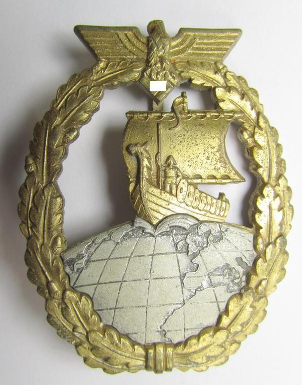 The truly very attractive - and actually rarely seen! - WH (Kriegsmarine) 'Hilfskreuzer-Kriegsabzeichen' (or: auxiliary-cruiser war-badge) being a luxuriously executed, neatly maker-marked- and/or: (partly) 'Buntmetall'- ie. zinc- (ie. 'Feinzink'-) based example as was produced by the desirable maker (ie. 'Hersteller'): 'Schwerin - Berlin' and that comes in a wonderful and IMO only minimally used- ie. worn, condition. The piece has a neaty golden-coloured- and zinc- (ie. 'Feinzink'-) based wreath and shows a seperately attached globe (which is executed in silver-toned- and/or: 'Buntmetall' based metal). It comes naturally mounted on its fully functional and flute-shaped pin (which is of course fully functional) and has a totally unaltered catch. The badge is most certainly never cleaned and retains all of its golden- ie. silver-toned finish (ie. it is neatly so-called: 'Feuervergoldet'). It only shows some minimal tarnish (it has IMO never been cleaned nor polished though). It is - as stated above - a neatly maker-marked example that is unmistaken a quality-procuded piece that can with certainy be attributed to the maker (ie. 'Hersteller') named: 'Schwerin' based in the town of Berlin. It should, moreover, be noted that these (partly) zinc- (ie. 'Feinzink') 'Schwerin'-examples (having a 'Buntmetall'-based globe attached) are actually much more rarely encountered that their entirely 'Buntmetall'-based, counterparts. Simply a very attractive WH (Kriegsmarine) 'Hilfskreuzer-Kriegsabzeichen' that is IMO priced according to its comparative rarity and/or unmistaken desirability!