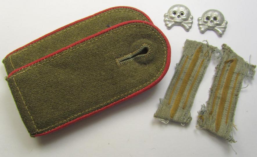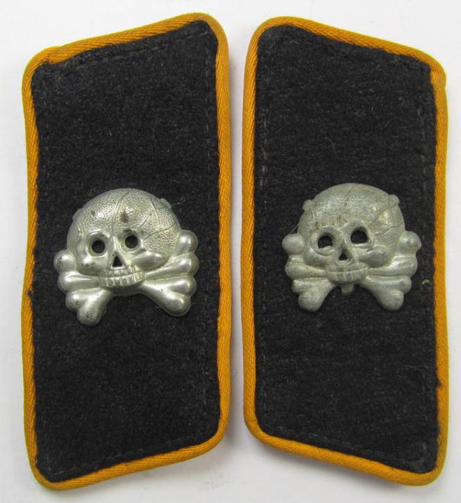 This very attractive 'Panzer-Aufklärung'-collar-tab-pair (ie. 'Kragenspiegelsatz für Panzer-Aufklärungs-Truppen'-) is as stated above fully matching and both pieces show the brownish-yellow-coloured- (and/or: typical 'buckram'-based-) backings and both show a detailed zinc- (ie. 'Feinzink'-) based (and/or identical) skull-device (ie. 'Totenkopf'), period-attached: both skulls have their three (also zinc-based-) prongs in place and are both still firmly period-attached onto the tabs (as can be seen on the pictures). The pair - which has the neat (IMO mid- ie. later-war-period-) 'silk'-like-type- and/or: golden-yellow- (ie. 'goldgelbener'-) coloured piping attached - comes in an IMO surely issued- and/or: once-tunic-attached condition: some of its original, period-stitching (with which it was once tunic-attached) is still visible (as can be seen on the pictures). This very attractive pair originates from a private household in Germany where it was recently found together with the golden-yellow-piped shoulderstrap-pair that I offer under number 47018: both items belonged to the same 'Panzer-Aufklärung'- (ie. reconnaissance-) soldier who wore these insignia and stored them for decades. Simply an excellent 'Panzer-Aufklärung'-type collar-tab pair that is ideally fitted to restore a black-coloured Panzer 'wrap-around'-tunic or to be stored in any cloth-insigna collection. These (matching) collar-tab-pairs can nowadays easily be graded 'rare' and are almost impossible to encounter!