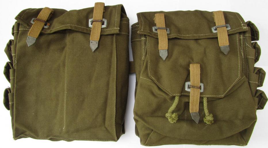 This is a very attractive - and actually not that easily found! - WH-equipment-item: a mid-war-period pair of WH (Heeres ie. Waffen-SS etc.) so-called: 'Munitionstaschen für Pionier-Truppen' (or: magazine- ie. equipment-pouches for enigineer-troops) being a clearly maker- (ie. 'RB-Nr.-0/1305/0173'-marked- ie. ink-stamped) pair that comes in an overall very nice- (ie. 'virtually mint- ie. unissued'-), condition. The pair - which is connected by means of a typical webbing-based 'strap' as to be expected - is executed in the 'typical' greenish-coloured- (and thicker-structured- ie. somewhat course-like-) linnen-based cloth and retains all its brownish-yellow-coloured- and/or linnen-based straps present and in place (these also show the zinc-based- and non-marked 'end-pieces' as can be seen on the pictures). Moreover, are all greyish-coloured zinc-based metal parts (and ropes) present and in place. The set retains all its K98-ammunition pouches on its sides which have all functional, 'Prym'-marked snaps in place (as can be seen on the pictures). The pair clearly shows makers'-designation or ink-stamp (that reads: 'RB-Nr.-0/1305/01/73'). The pair originates from a German flea-market where it was recently found as such: it shows some minimal age-ie. staining simply caused by having been stored as such for decades (as can be seen on the pictures). In any case a very nicely preserved WH (Heeres ie. Waffen-SS etc.) 'Pionier'-equipment-set that will be impossible to be upgraded. Only the first such equipment-piece in this 'virtually mint- ie. unissued' I ever had on offer!