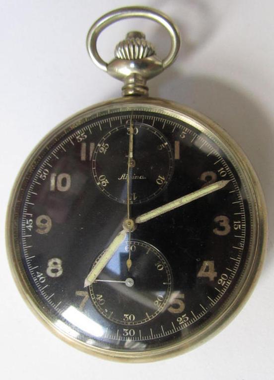 This is a truly very attractive - and/or very rarely encountered! - example of a WH (Kriegsmarine ie. 'Marine-Artillerie') pocket-watch ('Dienstuhr o. Chronograph') of the make: 'Alpina', having a black-coloured dial-plate and/or engraved back-plate that reads: 'Artl.5198' and that shows a neatly engraved 'Reichsadler' with below an engraved capital 'M'-character, in overall very nice and/or fully functional, condition. These pocket-chronographs - having a standard 'Cal. 40'-movement (see pictures) - were distributed at a very small scale to the various NCOs and/or officers of the: 'Deutsche Wehrmacht' ie. Marine-Artillerie-Truppen and were properly entered in both: 'Wehrpass' and/or: 'Soldbuch'. They had to be engraved with a 'Reichsadler'-symbol with below an engraved capital 'M'-character (denoting naval- ie. 'Marine'-usage): next to this they had to be uniquely numbered- ie. marked with the signification and/or unique number: 'Artl.' as is the case with this example (see pictures). As stated has the piece on offer here a fully undamaged black-coloured dial having a subsidiary 'seconds'-dial at the 6 o'clock-position and an additional chronograph-dial at the 12 o'clock-position. The piece has a very attractive (and virtually undamaged- and very nicely engraved-) casing (which is executed in nickle-silver-based metal): the watch just shows some minimal wear and/or age. As stated above is the piece still functional and running. Simply a very attractive and truly rarely encountered time-piece: I deem that I have priced this attractive WH (Kriegsmarine ie. 'Marine-Artillerie'-related-) equipment-piece accordingly!