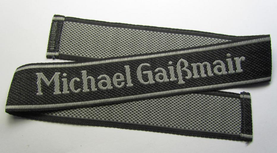 This is a truly very attractive - and naturally 100% original and truly rarely encountered! - so-called: 1944-pattern, Waffen-SS, enlisted-mens'-type cuff-title (ie. 'Ärmelstreifen') depicting the ('BeVo'-) machine-woven Latin-script text in silver-greyish-coloured linnen, as was intended for usage by a soldier ie. NCO who served within the: 'SS-Gebirgsjäger-Regiment 12 "Michael Gaißmair" (being a regiment within the '6. SS-Gebirgs-Division "Nord"), in overall very nice (ie. virtually mint-/unissued-) condition. The truly full-length cuff-title (approx. 48/49 cms. sized in length) has the typical 'salt and pepper-styled'-reverse and shows all details of an original, period-produced specimen as to be expected. This armband was produced by the: 'Bandfabrik Ewald Vorsteher' (aka: 'BeVo') as based in the town of Wuppertal and shows the interwoven company-name on one of the ends (something that is not always the case - see pictures). This cuff-title is naturally a 100% text-book - and as stated above - original example that originates from a US-veteran who 'liberated' this piece in 1945. The piece was with certainty never worn nor tunic-attached and can easily be graded 'mint-/unissued'. It should be noted that this specific regimental cuff-title is one of the rarest examples of the extensive 'BeVo'-weave pattern series. Simply a great opportunity to acquire an attractive and very rarely encountered Waffen-SS 'BeVo'-type cuff-title for a competitive price: I have seen these "Michael Gaißmair"-cuff-titles sell for much more than my asking-price!