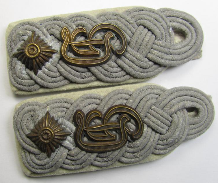 This is a truly very attractive - and/or fully matching and with certainty rarely encountered! - WH (Heeres) officers'-type-, 'cyphered' shoulderboard-pair (showing a rarely observed, regular-sized- and/or golden-bronze-toned 'GD'-cypher-pair period-attached!) as was intended for - and used by! - an: 'Oberstleutnant eines Infanterie-Abteilung' who served within the famous 'GrossDeutschland'-division and that comes in an overall very nice- (albeit moderately used- and/or clearly tunic-removed-), condition. The shoulderboards - which are piped in the white- (ie. 'weisser'-) coloured branchcolour - are executed in the 'smooth-type'-wool as to be expected (as can be seen on the pictures). The boards - which measure approximately 10,5 cms. each - have the greyish-silver-coloured 'upperdecks' and come mounted on their (typical, smaller-sized) officers'-type tongues attached. As stated above, have the boards a pair of (matching-, regular-sized- and/or neatly golden-bronze-toned- (and minimally tarnished-) so-called: 'GD'-cyphers and two (equally golden-bronze-toned and regular-sized-) pips period-attached denoting the officers'-rank of: 'Oberstleutnant' (or: lieutnant-colonel). The neat cyphers and pips still retain their original prongs in place and retain a somewhat faded- and/or golden-toned- ie. tarnished finish: of additional interest is, moreover, the fact that all four devices were applied onto the boards before they were fully assembled (see pictures). The pair was issued and clearly worn as such (as can be deducted from the present condition). This pair originated from a larger cloth- ie. insignia-collection I recently acquired. Simply a very attractive and actually rarely encountered, 'cyphered'- and fairly high-ranked, officers'-type 'GD'-shoulderboard-pair that belonged to an infantry-officer who served within a famous WH 'elite'-regiment!
