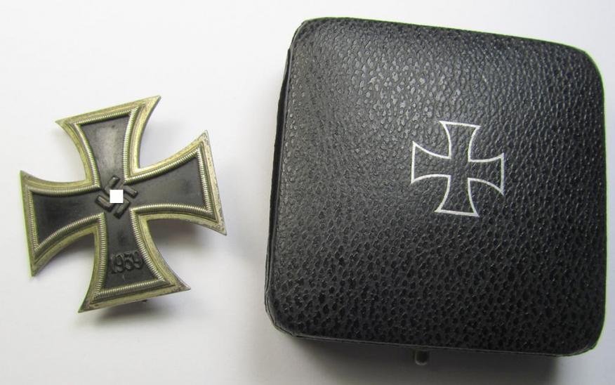 This is an attractive - and with certainty early-war-period - example of an: 'Eisernes Kreuz 1. Klasse' (or: Iron Cross 1st class) being an attractive albeit non-maker-marked example as was executed in the so-called: 'Schinkel'-format ie. pattern as was produced by the desirable maker (ie. 'Hersteller'): 'Wilhelm Deumer' and that comes stored in its typical 'WD'-type etui as issued and that comes in an overall very nice- (ie. surely issued- ie. worn-), condition. The non-magnetic cross has a very attractive age-patina and retains truly great detail: the black-coloured core shows no damage whatsoever: the (somewhat 'shiny'- ie. satin-like-) black painted core is nicely preserved without showing any real damage (as can be seen in the pictures). The piece retains, moreover, a fair bit of its so-called: 'hochpolierte Kanten' (as can be seen on the pictures). The (flute-shaped) pin and catch (ie. set-up) are naturally unaltered and/or fully functional. The cross - which is a minimally-vaulted ie. converse-shaped example as more often - was produced by the desirable maker: 'Wilhelm Deumer' as based in the town of Lüdenscheid. The piece came stored in its typical etui as issued and/or stored for decades: also, this etui comes in an overall nice condition and shows a white-beige-coloured- and velvet-based inner-section and fully preserved silver-coloured IC-symbol on its top. Simply a very attractive - and rarely seen! - 'Schinkel'-IC first-class-set by the 'Wilhelm Deumer'-company that was never before in any collection and that is priced according to its rarity and/or desirability!