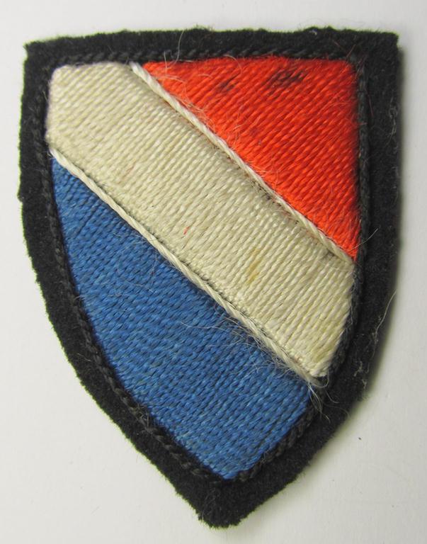 This is a truly very attractive - and very rarely encountered! - example of a (presumably) Dutch-produced example of an early-pattern- ('pointed styled') Waffen-SS 'volunteer' arm-shield (ie. 'Ärmelschild') as was intended for usage by the Waffen-SS soldiers of the: 'Frw. Legion ''Niederlande'' (and that was worn throughout the war) depicting the: 'orange/blue/white'-colours (ie. early-type Dutch national flag) and that comes in a very nice- and/or I deem issued- albeit hardly- or even never worn- ie. 'virtually mint'-, condition. The shield is (I deem) of the early (1941/1942-period-) type and was as stated above simply never worn nor tunic-attached (as can be seen on the pictures). I have various, similar examples in my own personal collection. It should be noted that these early-pattern- (ie. 'pointed styled') can be easily considered 'very rare': this is one of the very few such desirable examples I ever had on offer. Simply a nice occasion to acquire a 100% guaranteed original, Dutch-related, early-pattern volunteer-armshield: I deem that I have priced this rare Waffen-SS 'volunteer' arm-shield according to its rarity and/or desirability!