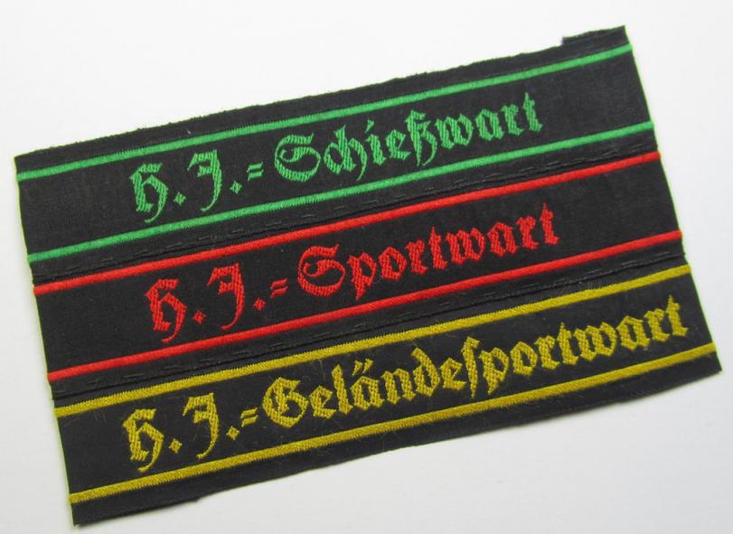 This is a really attractive - and truly unusual and never before seen! - period-assembled 'strip' comprising of three HJ (Hitlerjugend) cuff-titles ie. 'tunic-stripes' (ie. 'Ärmelbänder') as respectively intended for usage by a: 'HJ-Schiesswart' (or: shooting-instructor), a: 'HJ-Sportwart' (or: sports'-instructor) and a: 'HJ-Geländesportwart' (or: terrain-sports'-instructor) being a moderately used- ie. worn example that comes in an overall very nicely preserved condition. All three cuff-titles are clearly shortened and measure approximately 11.5 (ie. 12.5) cms. each: they are period stitched-together (by means of hand-stitching) and were presumably all once-tunic-attached (as can be seen on the pictures). All three colourful examples show folded ends and bear the remains of their period-attached 'RzM'-etikets on their backs (as can be seen on the pictures). It should be noted that these HJ (Hitlerjugend) cuff-titles ie. 'tunic-stripes' (ie. 'Ärmelbänder') rank amongst the most copied TR-insignia-pieces: the strip on offer here originates from a private household in Germany and is naturally of unquestionable originality. I personally deem that the strip on offer here (holding 3 of the 4 existing types!) was period-assembled by the bearer: I am, however, not sure if the piece was actually worn as such. Nevertheless, is this a rare (and possibly unique!) piece of HJ-cloth-insignia that I did price according to its comparative rarity and/or desirability!