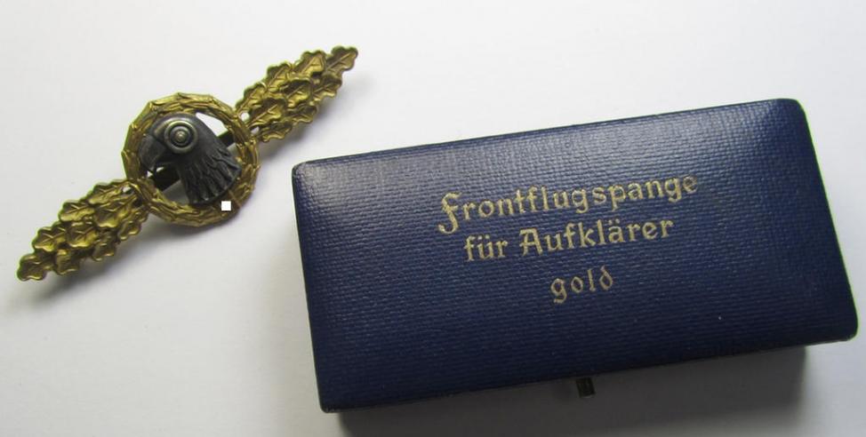 This is a truly very attractive and/or pronounced, 'Buntmetall'-based example of a non-maker-marked version of a WH (Luftwaffe) 'Frontflugspange für Aufklärer in Gold' (or: golden-class reconnaisance pilots'-clasp ie. FFS) that comes stored in its early-war-pattern etui as issued and or stored for decades. The superb piece comes in an overall very nice- (ie. only moderately used- and/or worn-) condition and retains simply extraordinary detail. It retains most (ie. all!) of its period-applied bright golden-toned finish: the bluish-black-coloured- (and/or 'Buntmetall'-based-) eagles'-head-device (which is additionally attached to the clasp with a single rivet) is equally detailed and also retains all of its silver-toned and minimal 'tarnished' finish (as can be seen on the pictures). The clasp comes naturally in great shape ie. order: the (golden-coloured- ie. also 'Buntmetall'-based-) pin- ie. pin-attachment and/or single rivet are in fine (and/or undamaged nor repaired-) order. The catch is also in great undamaged order and of course fully functional. The clasp - which is most likely a quality-produced example as was produced by the the: 'C.E. Juncker'-company (as is more often the case) - has never been cleaned nor polished and has a neat and/or slightly tarnished 'age-patina'. It came stored into its darker-blue-coloured- and early-war-pattern etui (rare in itself) that comes in an overall nice- (ie. moderately used-), condition. The etui shows a fully preserved, beige-coloured velvet-like 'inlay' and silk-based inner-lining. Moreover, does it show the golden-toned- (and fully preserved!) text on its top that reads: 'Frontflugspange für Aufklärer - gold' (as can be seen on the pictures). The etui is only minimally used and shows some minimal age, wear and/or (water) staining as can be seen on the pictures. The set originated from a private household in Germany and was never before part of any collection. Simply a very attractive - and not that often encountered! - fairly 'high-class' Luftwaffe-award that is accordingly priced!