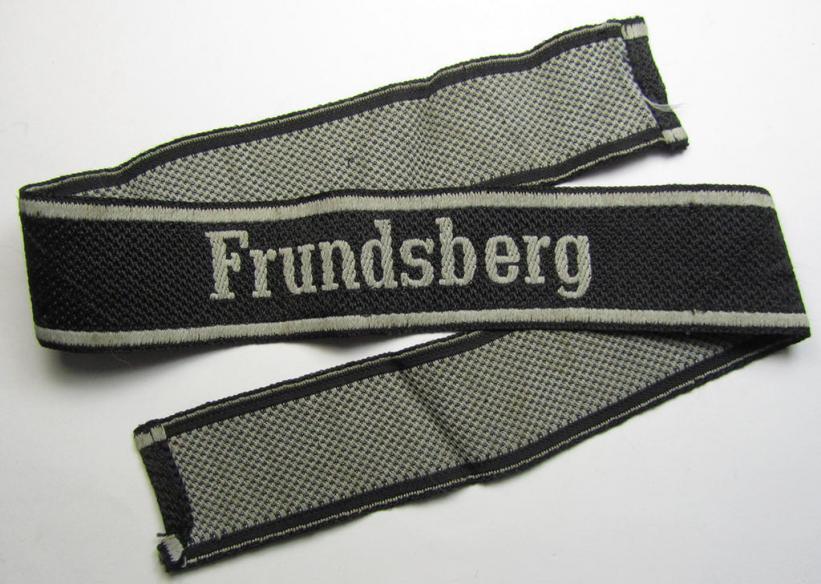 This is a very attractive - and naturally 100% original! - Waffen-SS, 1943/44 pattern cuff-title (ie. 'Ärmelstreifen') depicting the machine-woven Latin script-text in silver-grey linnen, as was intended for usage by a member of the: 10. SS-Panzer-Division 'Frundsberg' and that comes in an overall very nice- (ie. 'virtually mint- ie. unissued'-), condition. The full-length cuff-title (that measures approx. 48/49 cms.) has the typical 'salt and pepper' reverse and shows all details of an original, period specimen. This band was produced by the 'Bandfabrik Ewald Vorsteher' (ie. 'BeVo') in Wuppertal but is void of the interwoven company-name on one of the ends (something that is more often the case). This cuff-title is a 100% text-book- (and as stated above) original example that originates from a US-veteran who 'liberated' this piece in 1945. The piece shows some truly minimal staining and age (and is somewhat wrinkled) but was presumably never worn nor tunic attached. Simply a great opportunity to acquire a very attractive and rarely encountered, Waffen-SS 'BeVo'-type cuff-title for a competitive price!
