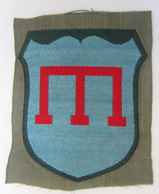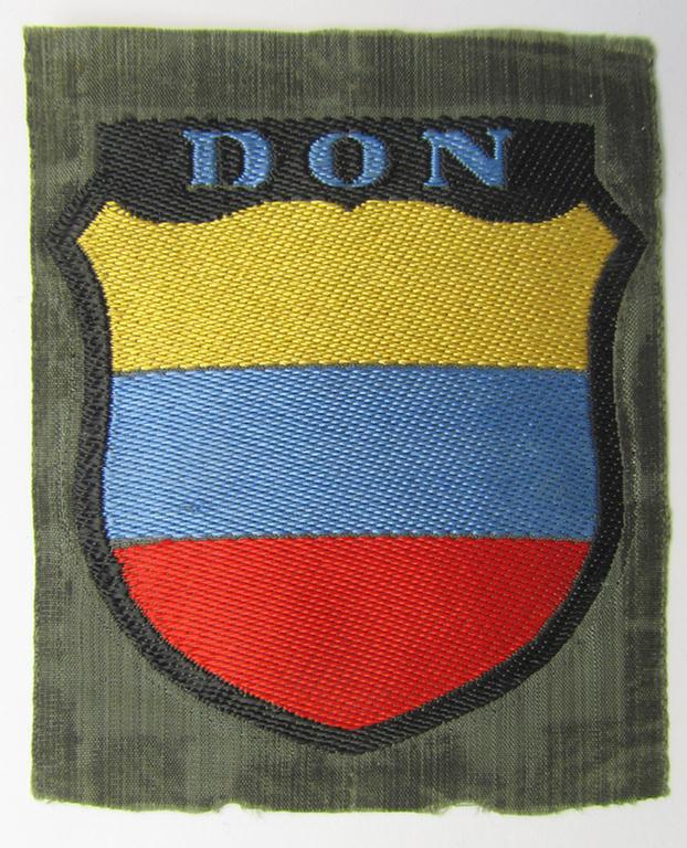 The very attractive - and with certainty very rarely seen! - arm-shield (ie. 'Ärmelschild') shows the light-yellow-, blue and red-coloured shield with above the interwoven characters: 'Don' (done in blue-coloured linnen). This particular example is neatly woven in the so-called: 'BeVo'-weave technique and comes as being straightly 'cut-off from the roll': it can be graded: 'virtually mint' but was presumably once glued into an album or scrapbook and does show some minimal (glue-?) staining on its field-grey-coloured background (as can be seen on the pictures). These - original - 'official' arm-shields as executed in 'BeVo'-type weave (ie. German manufacture by the company of 'BeVo') can be easily considered 'very rare'. I deem that I have priced this (virtually mint- ie. unissued- and never worn) example accordingly. Simply a superb example of a Cossack-related arm-shield: one of the rarest to encounter specimen of the colourful series!