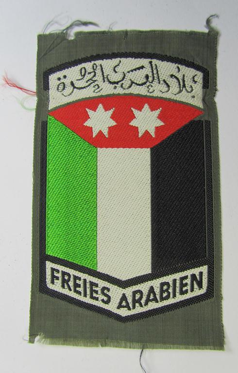 This particular armshield (ie. 'Ärmelschild') - showing a green-, white-, black- and/or red-coloured shield with above an (Arabic) text and showing the (German- and IMO translated) text: 'Freies Arabien' - is neatly woven in the so-called: 'BeVo'-weave technique and comes as recently found. It measures approximately 12,7 x 7,2 cms. and was never worn nor tunic-attached and comes as once 'straightly cut from the roll': it shows, however, a minor 'weave-failure' visible on the top of the black-coloured frame (as can be seen on the pictures). Moreover, does it show some mimimal age and/or staining (and/or minimal fraying on the bottom and/or top) simply caused by decades of storage only. These - original - 'official' arm-shields as executed in 'BeVo'-type weave (ie. German manufacture by the company of 'BeVo'!) can be easily considered 'very rare' and I have seen similar examples sell for four times my asking-price (!). The 'Free Arabian Legion' was a WWII-period-, German military-unit formed from Arab volunteers originating from the Middle East and North Africa. It was created by Amin al-Husseini and Rashid Ali when they suggested the formation of an army of Arab volunteers, which was adopted by Adolf Hitler in 1941. The unit was based on a smaller force, commanded by Hellmuth Felmy, mainly to assist the Pro-Nazi revolt in Iraq which was suppressed by the British. The unit was first settled in Syria and included several Iraqi expatriates and Syrian Arabs. After the conquest of Syria by the British, Australian and Free-French forces, the unit was moved to Sounion in Greece. There it received more Arab and Muslim troops who were on the soil of Europe at the time, as prisoners of war or as volunteers. The German High-command planned to use the legion in conquering the Caucasus, rising an Iraq government-in-exile there, and then use the region as a force-station and base for a way of conquering Iraq (an end that was never taken). In 'Operation Torch' the Allies took Tunisia, which had been governed by Vichy France. During the fighting the German command called on Tunisian Arabs to join the Legion. After the death of its commander, the 'Free Arabian Legion' was taken out from the Front, and in November 1943 the Legion served in Peloponnese as part of the forces involved in the Axis-occupation of Greece (as part of the 41st Infantry Division) and participated in the suppression of the Greek anti-fascist insurrection. I deem that this (virtually mint-/unissued-) example is accordingly priced!