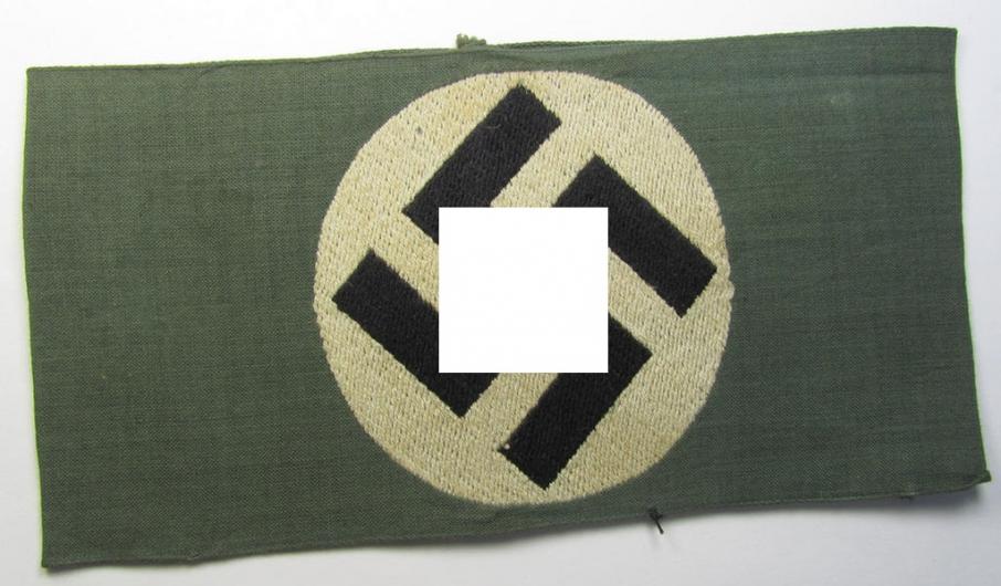 This is an attractive - and truly rarely seen! - example of a 'pre-war'-period- and reed-green-coloured, so-called: 'Der Stahlhelm' - Bund der Frontsoldaten (Sta)'-related armband (ie. 'Armbinde') being of the 'partly-woven'-type similar to the 'BeVo'-weave pattern and that comes in an overall very nice- ie. moderately used- ie. worn, condition. These linnen-based armbands were 'standard-issue' for usage by the various 'Stahlhelmbund'-members and/or officials and were worn on the left upper-arm. This example - having a total size of approximately 38 cms. and is 9,5 cms. wide as more often - is constructed from reed-green-coloured linnen and shows a neatly (interwoven) roundel that shows a machine-embroidered: 'swastika' (executed in a technique similar to the 'BeVo'-weave pattern). The black-coloured swastika is woven onto the reed-green-coloured and linnen-based armband (see pictures). This example shows a clearly present 'Stahlhelmbund'-related, blue-coloured ink-stamp that presumably reads: 'Bund der Frontsoldaten - Gau Minden Ravensberg - Ost u. West' (something that is more often seen). The piece is similar to the (much more easily found) N.S.D.A.P.- ie. SA-related armbands and is truly very nicely made and just shows minimal age, staining and/or wear (as can be seen on the pictures). Simply a very nice and with certainty desirable 'Der Stahlhelm' - Bund der Frontsoldaten (Sta)'-related item that is priced according to its comparative rarity!