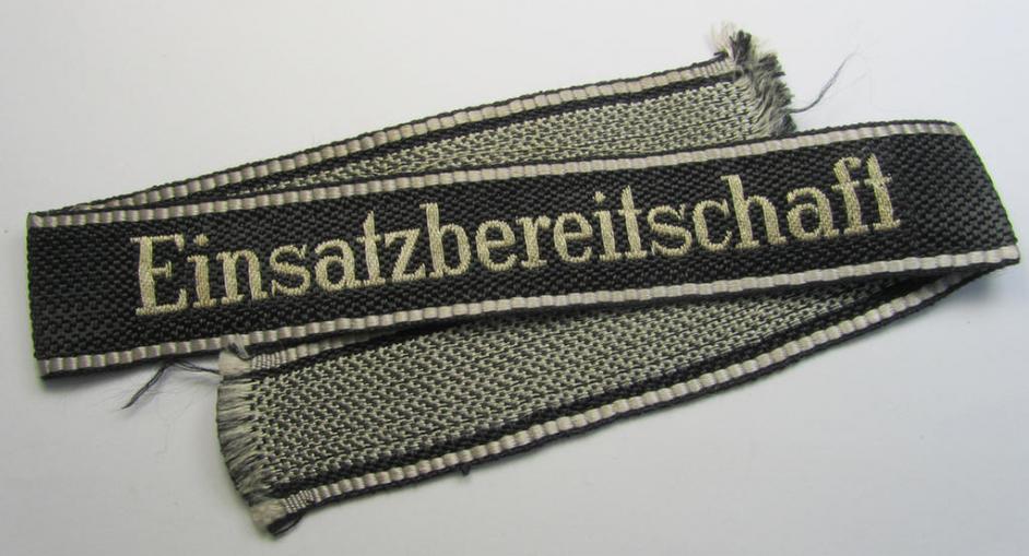This is a truly very attractive - and naturally 100% original and with certainty very rarely seen! - NSKK- (ie. 'National Socialistischer Kraftfahr Korps') officers'-pattern cuff-title (ie. 'Ärmelstreifen für Offiziere') entitled: 'Einsatzbereitschaft' (as was specifically intended for officers serving within the NSKK-emergency-service) and that comes in an overall very nice- (ie. minimally used- albeit IMO never tunic-attached-), condition. The full-length cuff-title (that measures approx. 49 cms. as more often) has the typical 'salt and pepper'-reverse and shows all details of an original, period specimen. This band was with certainty produced by the 'Bandfabrik Ewald Vorsteher' (ie. 'BeVo') in Wuppertal but is void of the interwoven company-name on one of its ends (something that is 'standard' with flat-wire-woven examples). This cuff-title is a 100% text-book - and as stated above - original example as executed in the Roman-style script that originates from a US-veteran who 'liberated' this piece in 1945. The piece shows some truly minimal staining and age but was IMO never tunic-attached: it does, however, show some age and or staining (as can be seen on the pictures). Of additional interest is to mention that these 'Einsatzbereitschafts'-cuff-titles are often mistaken for the similarly executed Waffen-SS counterparts: these examples were merely intended for NSKK-usage. Simply a great opportunity to acquire a very attractive, NSKK- (ie. 'National Socialistischer Kraftfahr Korps') and 'BeVo-Metallfaden-gewebtes'-type cuff-title for a competitive price!